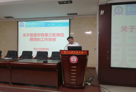 会议由党委书记陶玉顺主持。院长李烨向大会通报了《中共体育竞猜网(中国)官方网站委员会体育竞猜网(中国)官方网站关于做好管理学院第三轮岗位聘用工作的通知》,具体介绍了学院第三轮岗位聘用工作领导小组成员、第三轮岗位聘用工作安排,并要求全院教职工按照要求准时提交岗位竞聘材料,并鼓励中青年教师积极提高自身学历、职称。