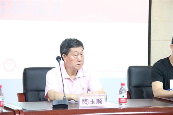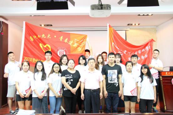 学院党委书记陶玉顺对同学们提出了学院的期望。他用幽默风趣的语言介绍了本次实践的目的地松桃县,讲述了松桃县的历史与境况。接着他鼓励大家,一定要努力克服困难,要以坚定的信心投身到社会实践中去。希望大家能够带着自己的专业知识走到乡间、服务村民,成为管理学院服务农村服务基层的先遣队。最后,陶书记为管理学院暑期社会实践队授旗,实践队成员罗宏、安学磊代表大家接过了庄严的队旗。