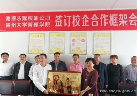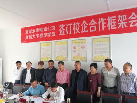 为丰富大学生实践基地资源、促进产学研相结合、强化大学生实践能力,2017年4月7日,由管理学院党委书记陶玉顺书记带队,院长李烨教授、副院长宋山梅教授、校发展规划处副处长冉光圭教授、李毅教授、高波教授、王云副教授同行,对湄潭县永隆粮油有限公司开展实地调研,并与该公司签订了校企合作框架协议及共建本科生、研究生实践基地协议,同时举行了实践基地授牌仪式。