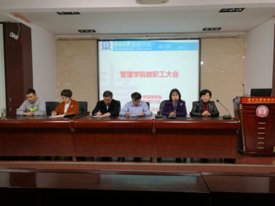 会议由党委书记陶玉顺主持。首先院领导班子就各自分管的工作向全院教职工进行通报,包括管理学院研究生复试工作安排及纪律要求、为提高教学质量而举行教学观摩比赛、学位论文抽检与送审、教职工集体舞比赛、工会换届、院党委党建考评等工作。
