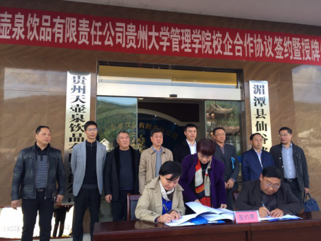 11月10日,体育竞猜网(中国)官方网站与贵州天壶泉饮品有限公司在遵义市湄潭县举行校企合作框架协议签约仪式暨体育竞猜网(中国)官方网站本科生研究生实习基地挂牌仪式。体育竞猜网(中国)官方网站书记陶玉顺、副院长宋山梅、李桥兴教授、办公室主任纪雅、李会萍副教授、王云副教授、旅游与文化产业学院书记刘剑、罗阳教授等出席活动。