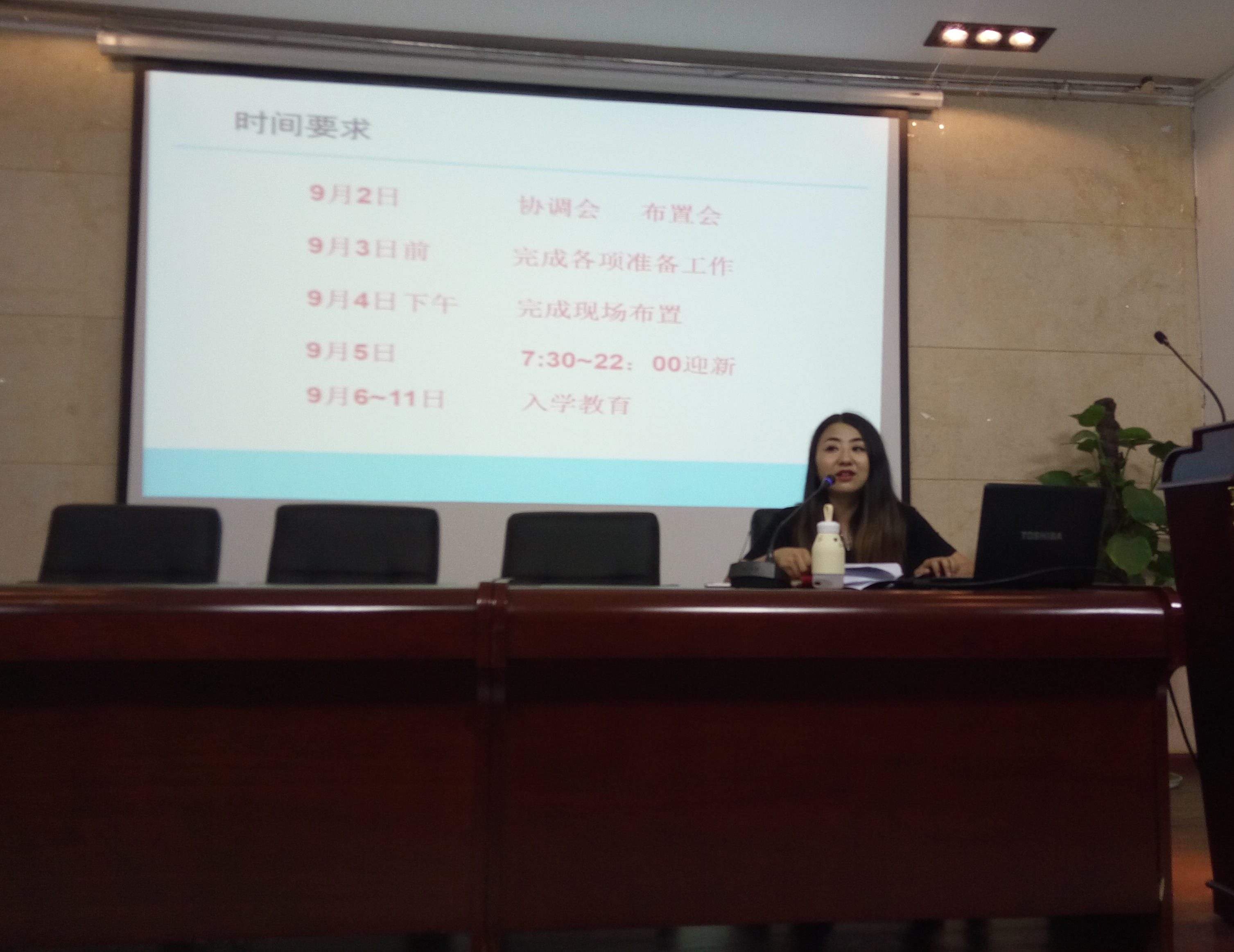 陈老师给我们详述了新生报道注册的具体流程,安排新生报道注册期间和入学教育期间具体工作任务。新生报到注册时间为9月5日;入学教育的时间是9月6日至11日。会上,陈老师还强调迎新工作应达到“零事故”、“零差错”、”关心学生“、“爱护学生”、“严格要求”、“正面引导”等六个要求。至此,2016级研究生新生入学工作安排会议顺利结束。