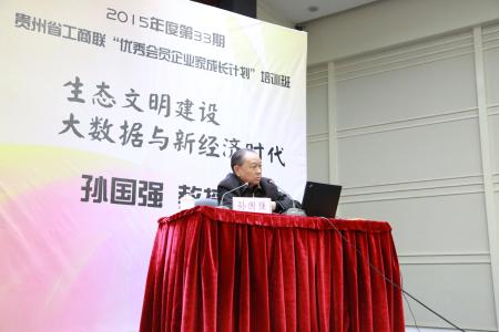 此次培训由贵州省政协副主席孙国强主讲两场讲座。上午的主题是“可持续发展”,演讲主要围绕我国现有经济发展方式存在的主要问题和加快转变经济发展方式的重要意义以及可持续发展、循环经济等当前热点问题展开深入的剖析。下午孙国强教授给大家带来了以“新经济时代”为主题的精彩演讲,演讲分为“新经济时代是全面彻底颠覆当代创新未来的伟大时代”和“新经济时代的十大规则与若干要点”两个部分。分析了颠覆式十大新技术与新业态和十大颠覆式金融新业态;总结了新经济时代的特点、规则;重点谈到了大数据时代背景下必须具备的互联网思维以及颠覆式创新的本质与模式等。
