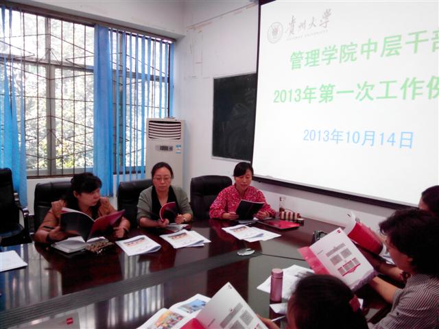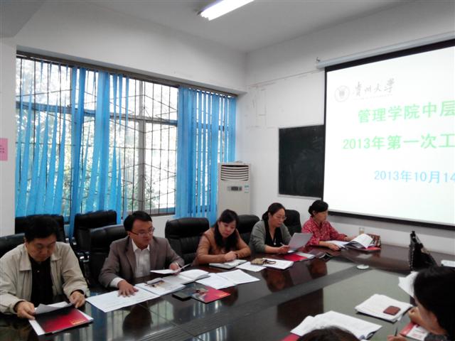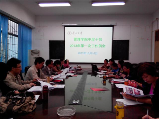 2013年10月14日上午,体育竞猜网(中国)官方网站在致远楼210会议室召开管理学院2013年第一次中层干部工作例会,院党委陶玉顺书记主持会议,院长李烨,副院长林岚涛、王婷,副书记于松及各系、科室、中心负责人参加了会议。