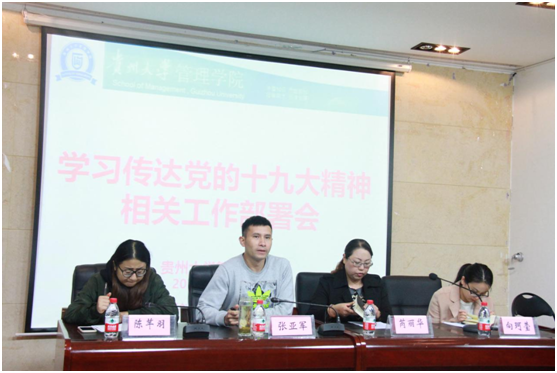 随后,张书记对学院组织学习宣传贯彻党的十九大精神相关工作进行了安排部署。首先,在学院层面将分别成立本科生和研究生宣讲团,深入到各班组织开展宣讲活动;其次,学院团委、院研究生会、研究生团总支、本科生学生会等群团组织要积极组织开展形式多样、丰富多彩的学习活动和比赛;各党总支、党支部、团支部和各班班长要利用党团组织生活、主题党日团日活动、班级沙龙研讨会等形式带领同学们进行相关学习,要确保学习富有实效。