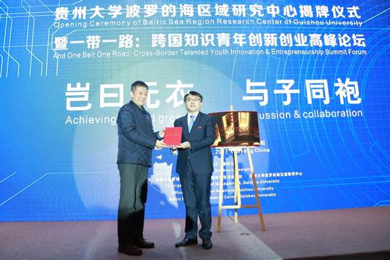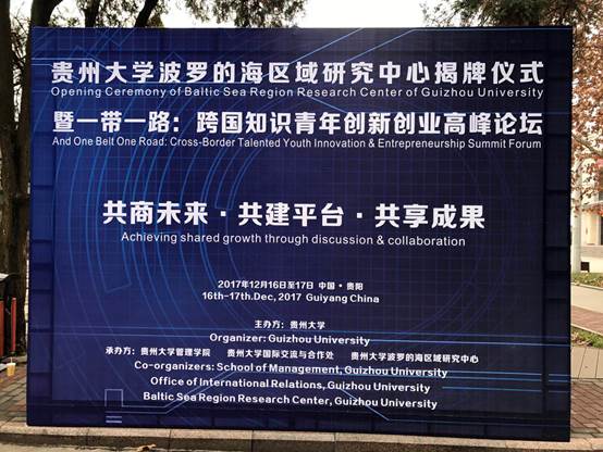 2017年12月16日,由贵州大学主办,体育竞猜网(中国)官方网站、贵州大学国际交流与合作处、贵州大学波罗的海区域研究中心承办的“贵州大学波罗的海区域研究中心揭牌仪式暨‘一带一路’跨国知识青年创新创业高峰论坛”开幕,贵州省教育厅副巡视员龚宁、贵州大学常务副校长王红蕾、贵阳市团市委书记吕槐乐,瑞典国家科研中心主任Aihie Osarenkhoe、立陶宛国家创新委员会副主席Vytautas Dikcius、立陶宛青年创业委员会秘书长Giedre Pociute、坦桑尼亚达累斯萨拉姆大学人文学院副院长Adam Omari Korotogo、坦桑尼亚达累斯萨拉姆大学人文学院科研中心主任Noel Biseko Lwoga、香港青年创业家总商会主席邝海翔、广东外语外贸大学南国商学院副校长杨励、沸腾创投董事长谢一锋、贵州国际酒类博览会股份有限公司董事长戴军、贵州楚天环保有限公司董事长胡文、贵景领远信息技术有限公司总经理王纪文、溪云小镇管理人员等国际学者、国内兄弟院校负责人、省内企业家代表,贵州大学国际交流与合作处处长洪云、国际教育学院院长张成霞,体育竞猜网(中国)官方网站院长李烨、副院长王婷、宋山梅、周莉莉,党委副书记张亚军及部分教职工,贵州大学波罗的海区域研究中心相关负责人及校友500余人出席活动。