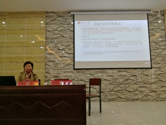 2018年3月23日应安顺市智力支边办、镇宁县政协及县扶贫办邀请,管理学院副院长宋山梅教授和校聘副教授刘遗志博士分别为镇宁自治县农村专业合作经济组织培训班100多人进行了“农村专业合作经济组织的运行与管理”和“农产品品牌经营与管理”专题讲座,受到了培训班学员的欢迎,并纷纷表示要请两位专家深入到乡村、农场就农村专业合作组织的发展和农产品市场营销进行指导。
