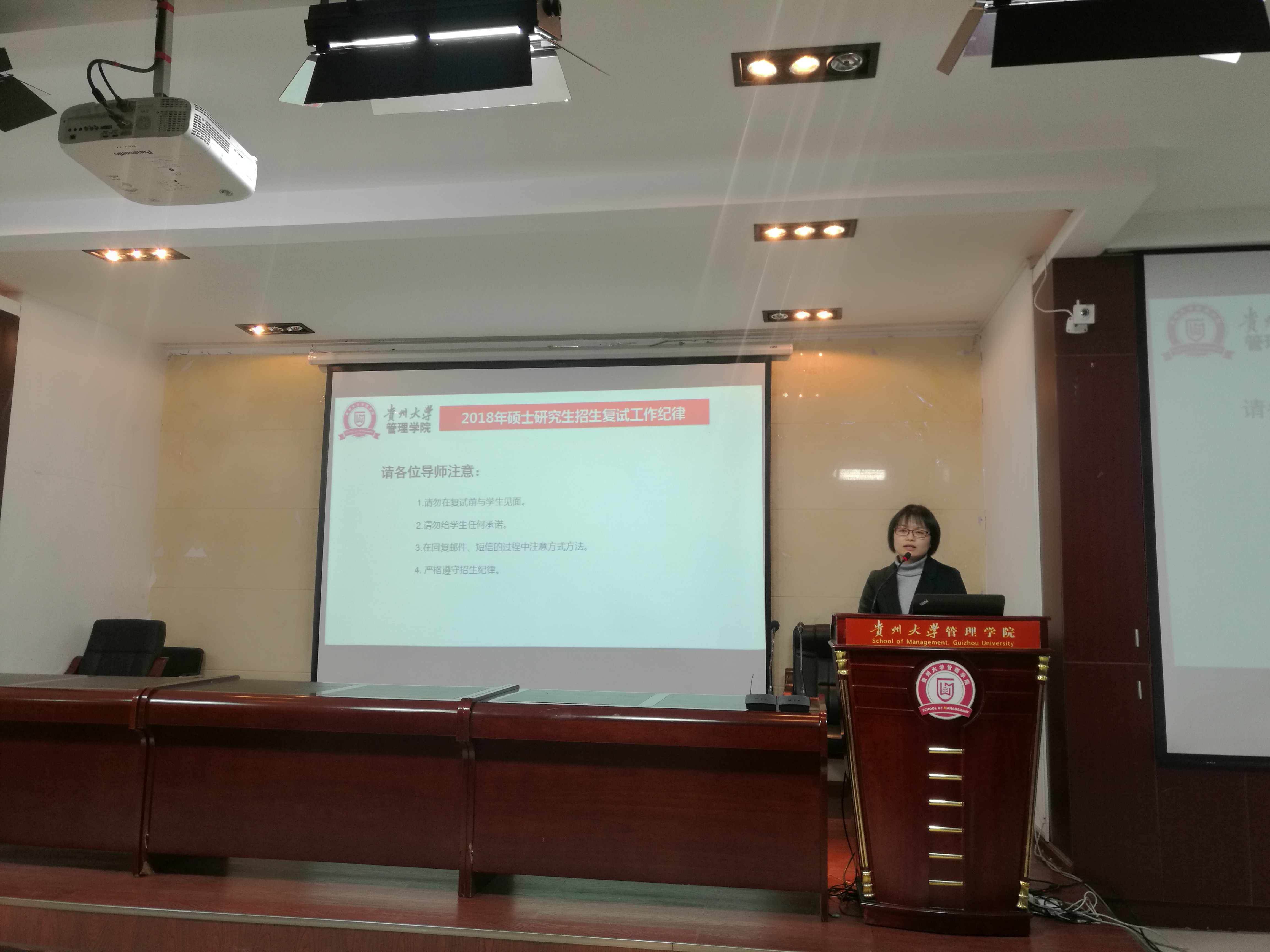 王院长向与会导师介绍了管理学院2018年学术型学位研究生入学考试成绩及一志愿上线人数的统计情况,并强调2018年硕士研究生招生复试工作纪律。王院长代表学院要求所有导师全面认识研究生复试,研究生招生复试工作社会关注度高、社会敏感度高,复试命题及答案启用前均属于国家机密材料,硕士招生复试政策性强(公平、公开、公正)、学术性强,是研究生招生的重要环节,也是保证生源质量的关口。所有导师应严格遵守教育部、省、学校、学院的招生复试工作纪律,严格维护复试过程中的考场纪律、面试纪律,坚持公平、公开原则,不提供任何形式的复试辅导;所有导师请勿在复试前与学生见面,请勿给学生任何承诺,在回复邮件、短信的过程中注意方式方法,严格遵守招生纪律。
