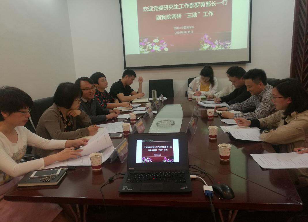 5月14日上午9:00,党委研究生工作部罗勇、研究生“三助”中心孟萌老师与研究生三助中心的调研团队到体育竞猜网(中国)官方网站开展研究生“三助”工作调研。管理学院院长李烨教授、副院长王婷教授、副院长周莉莉教授、党委副书记张亚军、党政办公室主任徐兰、研究生科副科长邵美婷及管理学院部分研究生助管参加调研会。