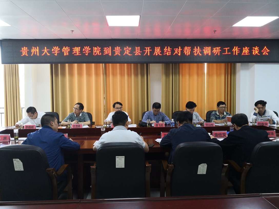 上午,李烨院长一行与贵定县委组织部马登宏部长等相关人员进行了座谈,双方就如何在贵定县的脱贫攻坚、乡村振兴、结对帮扶工作中加强合作进行了深入交流。贵州大学组织部唐飞虎副部长就贵州大学的基本情况做了介绍,,在脱贫攻坚的工作中,贵州大学立足贵州、服务贵州,充分发挥智力、技术和人才优势,积极参与大扶贫战略行动,为全省乡村振兴服务,为贵州决战脱贫攻坚、决胜同步小康贡献力量。李烨院长表示,学院将积极配合贵定县政府,充分利用管理学院的资源,全力支持贵定县的脱贫攻坚工作。