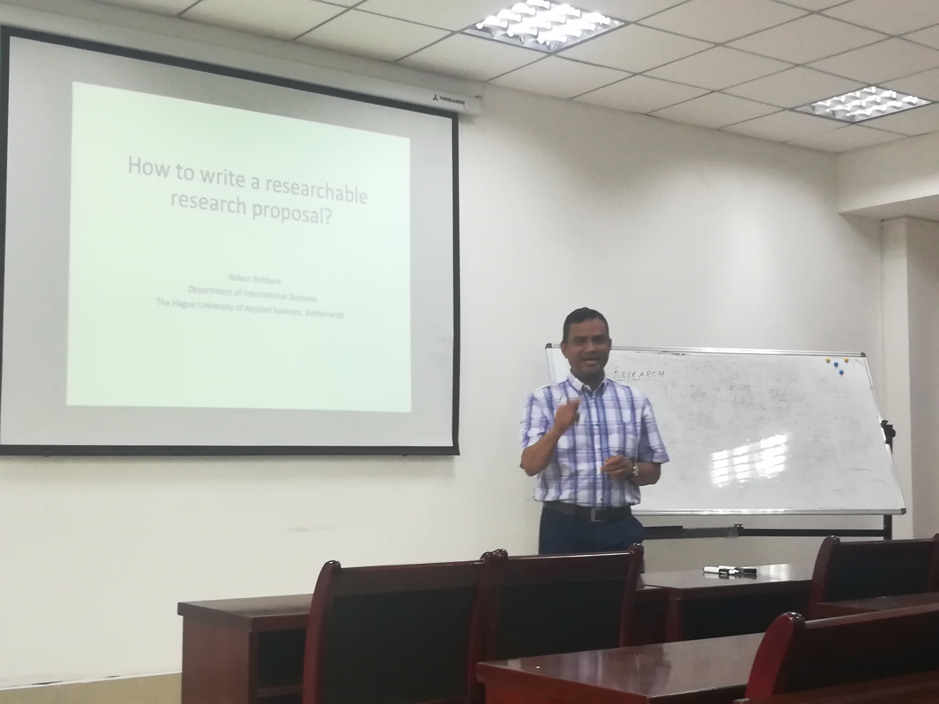 Golam Robbani教授是一位印度裔荷兰人,头发有些花白但人很有活力,对同学们也很友善,他全程用英语给大家交流但尽量在放慢语速来照顾大家的听力和理解。Golam教授先让我们每个人做了自我介绍,迅速拉近了我们的距离,然后他用一个生动的例子为大家解释什么叫“Research”,并以主题为“How to write a researchable research proposal?”展开教学。