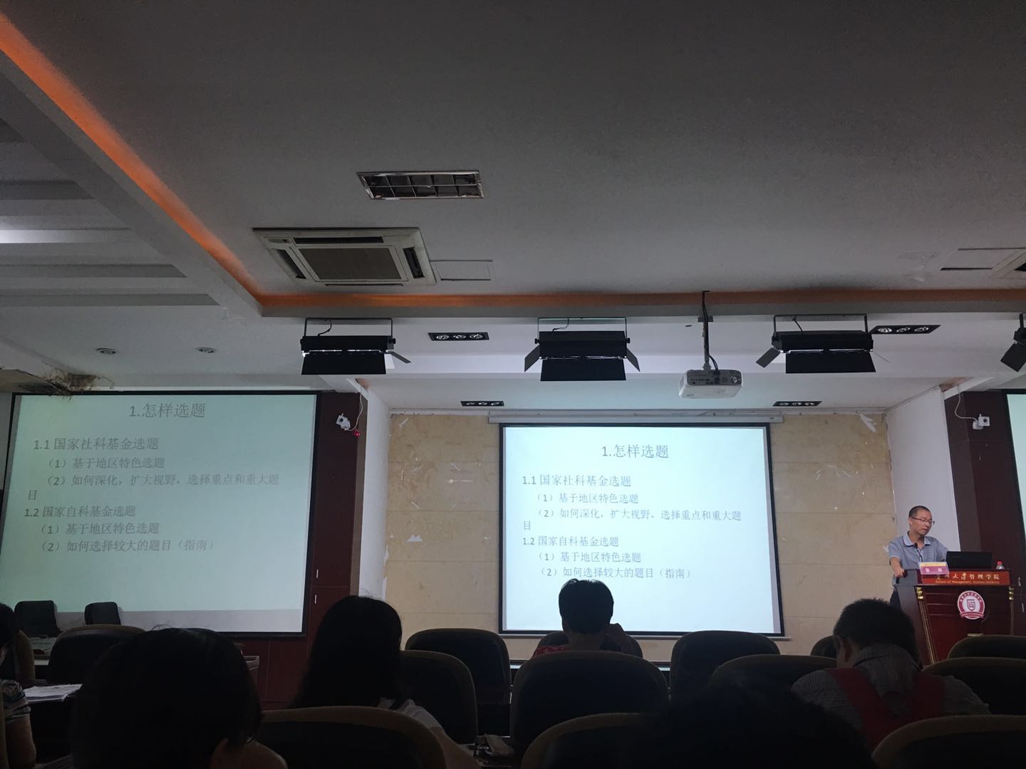 张教授从国家基金项目选题开始,从内容设计与论证、研究方法、完成项目的条件与保障等方面作了全面解读。张教授认为,选题要与符合课题指南的范围、方向和重点,同时又能紧密结合自身前期研究成果,彰显个性特色,要着重突出问题意识,关注社会热点和理论前沿,提高课题论证的创新度,特别强调国家社科基金项目必须符合主流意识形态的要求,符合国家战略目标和社会发展的需求,要尽量使选题理论联系实际,彰显时代性,反映当今阶段经济社会文化发展对理论研究提出的新要求,引领精神文化的正确价值导向。张教授认为,内容设计和论证必须做到思路清晰、观点鲜明、重点难点和创新之处具体,并从自身申报经验分点进行详细介绍;研究方法的选择要遵循问题导向、学科兼容、方法具体化、路径清晰等原则。张教授还结合自身研究经历对整个基金项目申请书整体设计提出了自己的看法。张伟教授讲座内容生动、数据详实,部分老师与张伟教授进行了互动交流,使参会教师受到很多启发。