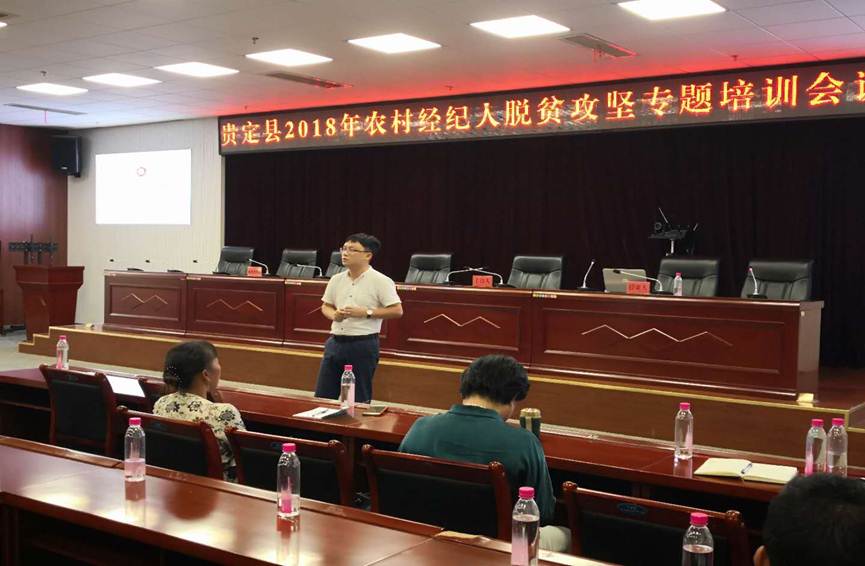2018年7月31日管理学院副院长宋山梅教授、营销与电商系副主任刘遗志博士应黔南州贵定县委组织部邀请,作为脱贫攻坚培训专家到贵定县参与“2018年农村经纪人脱贫攻坚专题培训会”,会上宋山梅教授作了“农村合作经济组织运行与管理”主题培训讲座,刘遗志博士作了“农产品营销与品牌建设”主题培训讲座。
