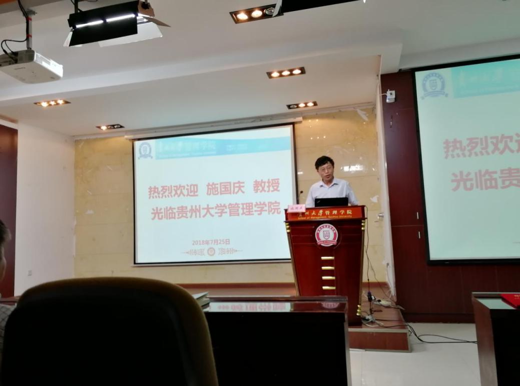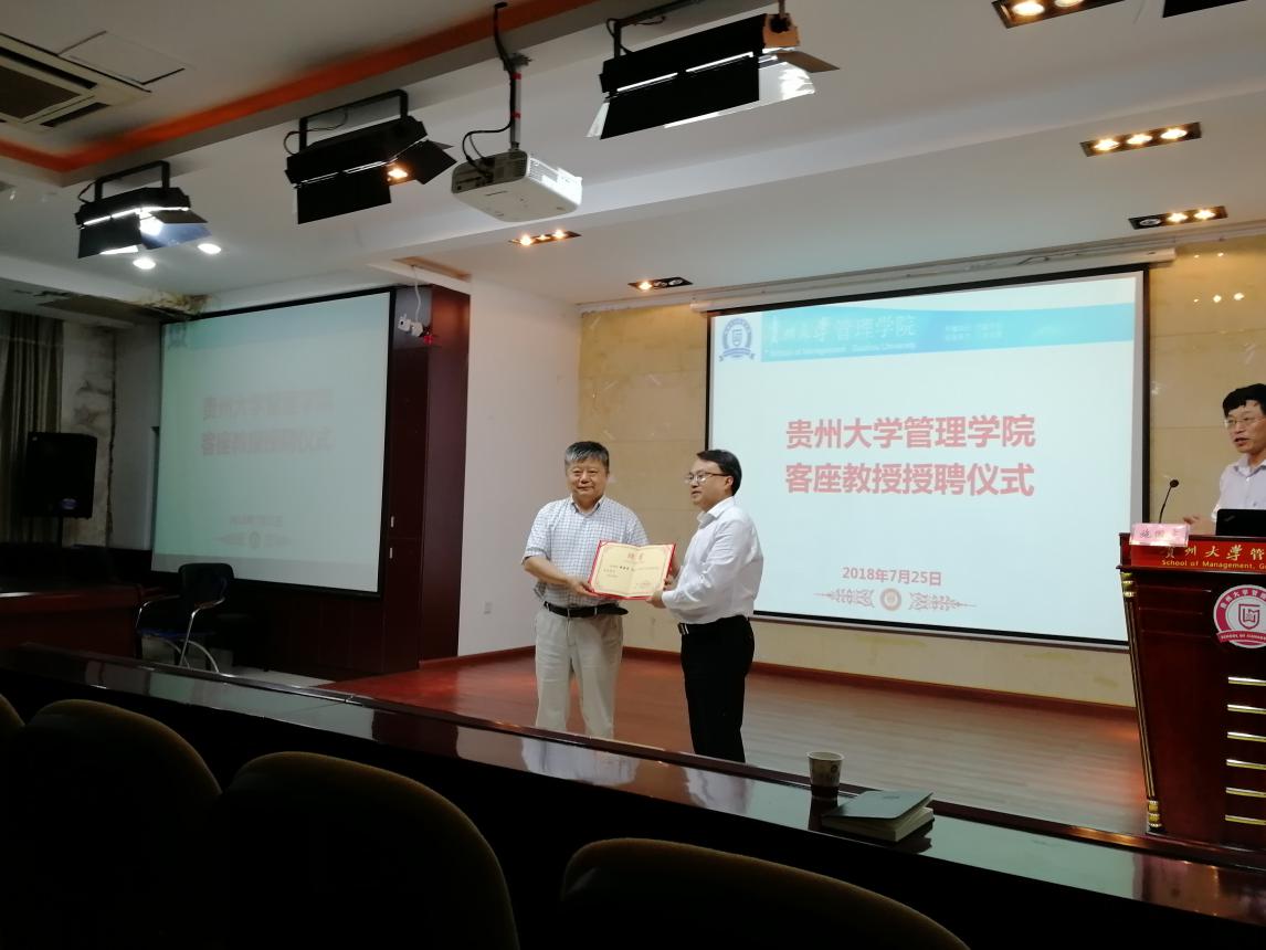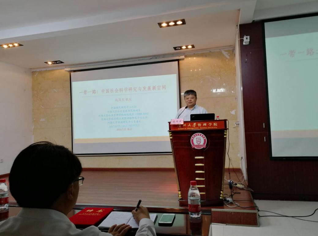 应我校管理学院邀请,河海大学公共管理学院创院院长施国庆教授于2018年7月25日15:30,在管理学院三楼报告厅开展了贵州大学2018年第40期文科讲坛,主题为“一带一路:中国社会科学研究与学科发展的新空间”,讲座由校哲学与社会发展研究院常务副院长、管理学院教授洪名勇主持,管理学院师生聆听。讲座前,管理学院聘任施国庆教授为学院客座教授,李烨院长为施国庆教授颁发聘书。