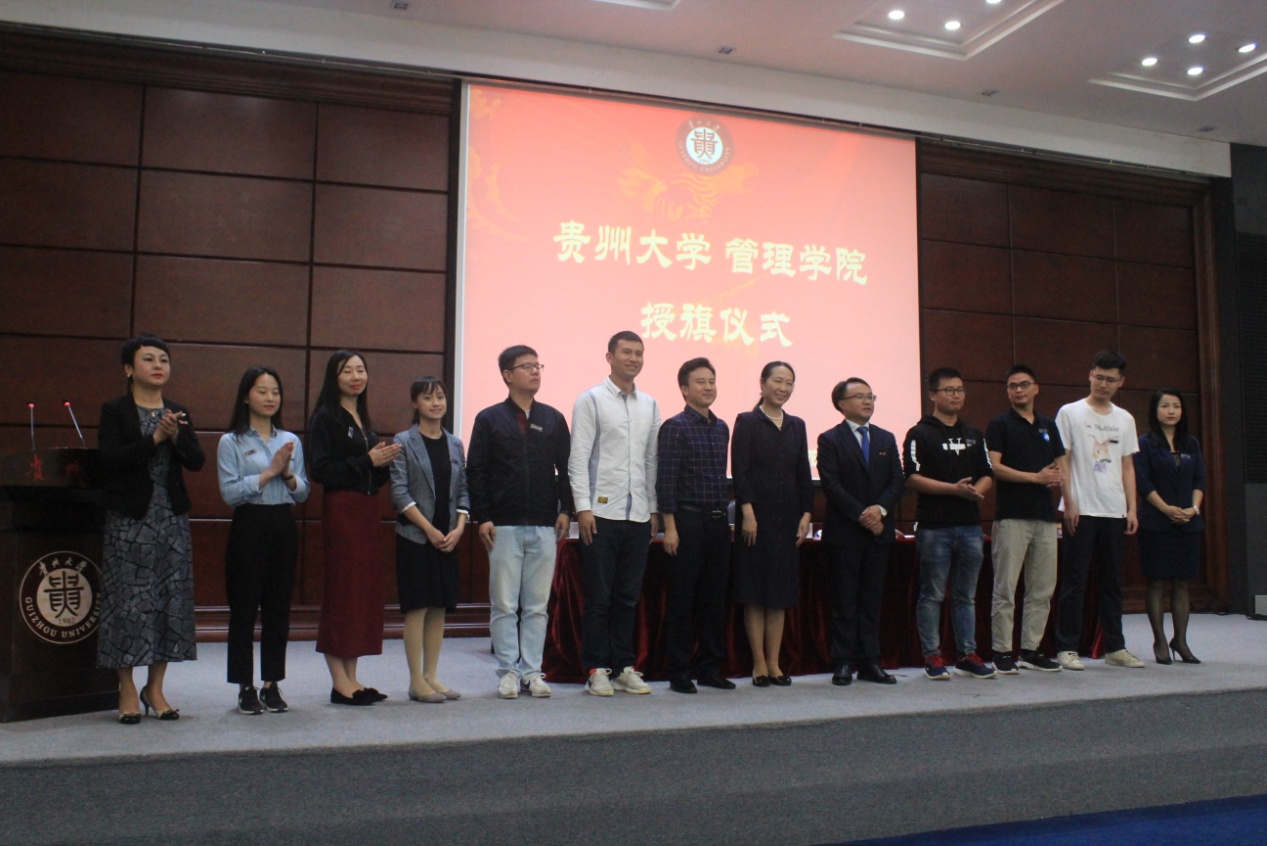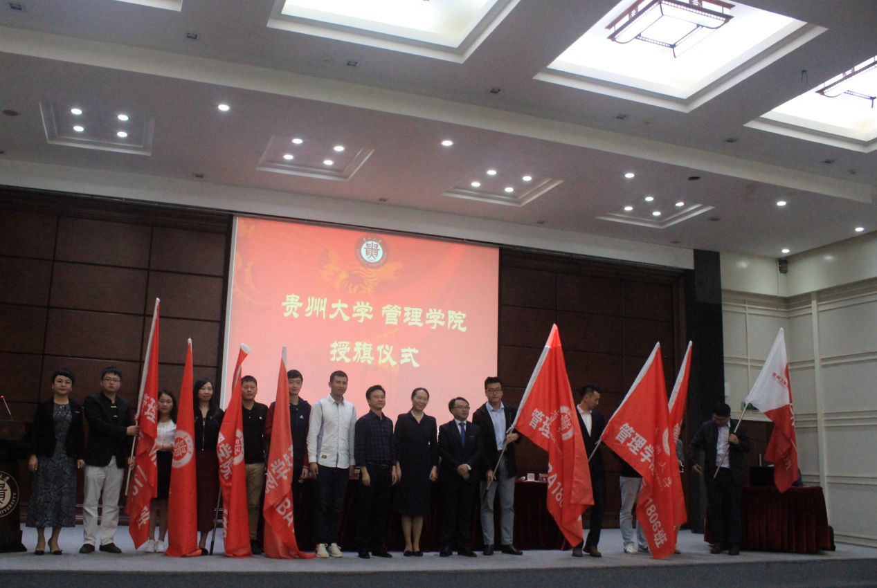 随后在场领导为各班学生代表佩戴了校徽,并且郑重的将班旗授予了各个班级,这象征着MBA同学正式融入贵大这个大家庭,翻开了新的求学篇章。