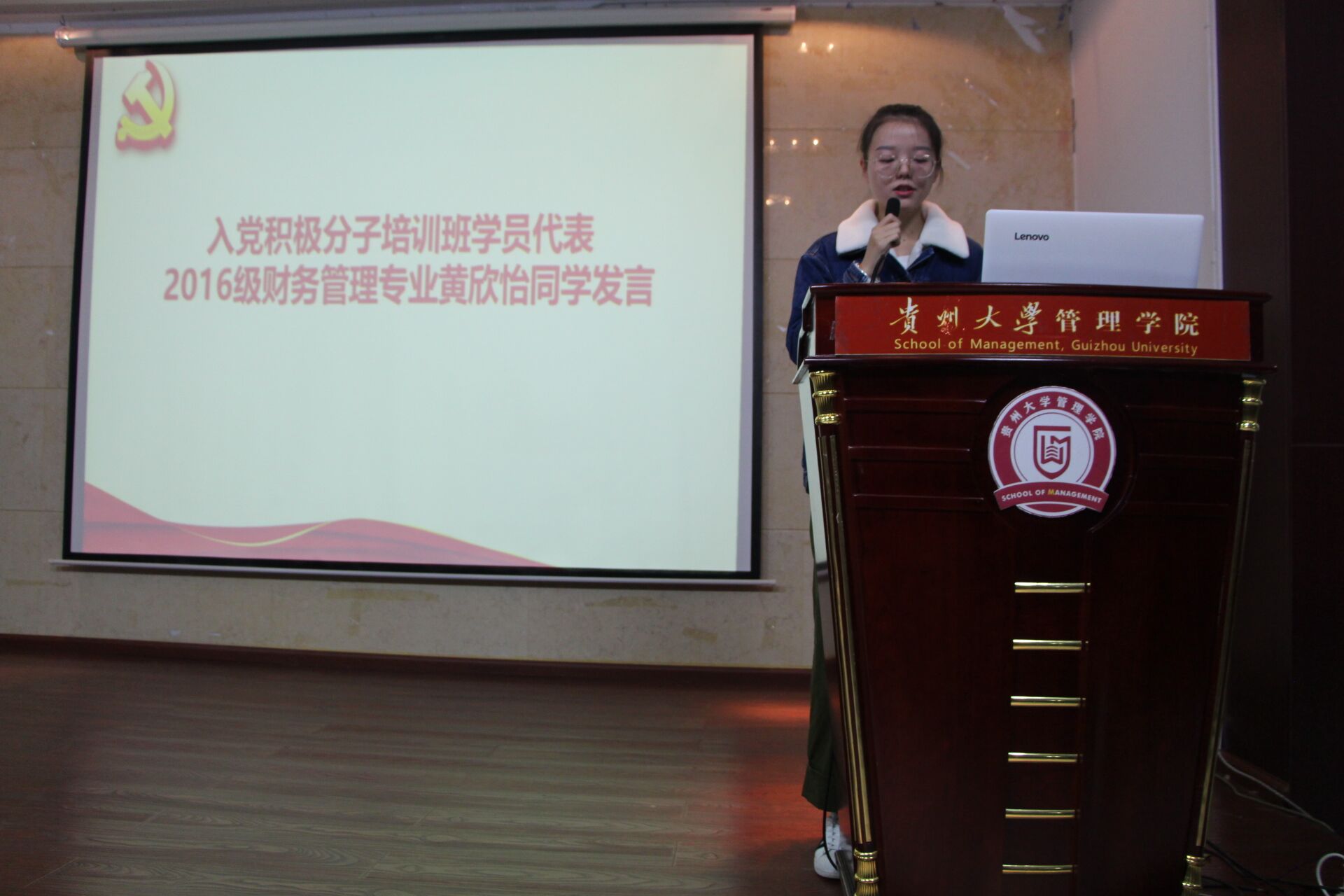 随后,入党积极分子培训班学员代表2016级财务管理专业的黄欣怡同学和发展对象培训班学员代表2015级财务管理专业韩芷若同学分别发言,两位同学表示入党积极分子和发展对象都要以一名党员的标准严格要求自己,成为学生榜样,努力学习,言行一致,贯彻党的十九大“不忘初心,牢记使命”精神,加强自身思想建设,主动承担社会历史责任,为实现中国梦奉献自己的一份力量。