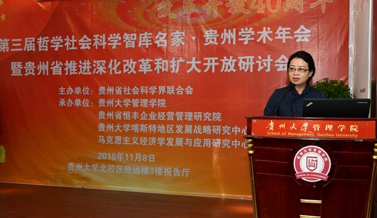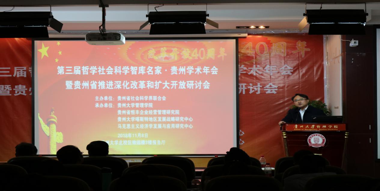 11月8日,由贵州省社会科学界联合会主办,体育竞猜网(中国)官方网站、贵州省恒丰企业经营管理研究院、贵州大学喀斯特地区发展战略研究中心、马克思主义经济学发展与应用研究中心联合承办的第三届哲学社会科学智库名家•贵州学术年会暨贵州省推进深化改革和扩大开放研讨会,在贵州大学北校区致远楼3楼报告厅隆重举行,来自全省社科界的专家学者和相关政府与企业的代表及贵州大学师生等150余人参加了会议。