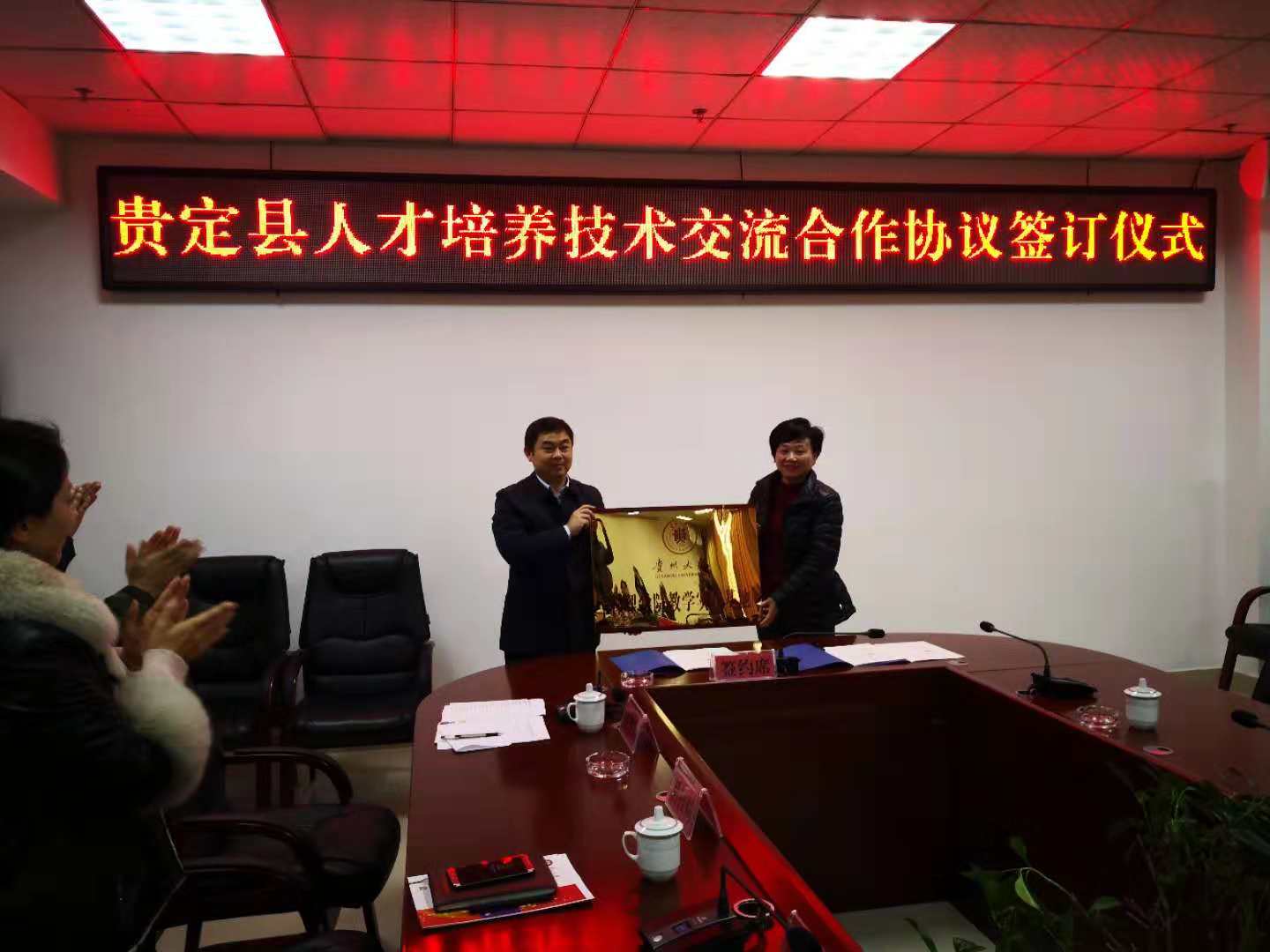 为丰富管理学院学生实践基地资源,促进产学研相结合,强化学生实践能力, 2018年12月6日上午,管理学院院长李烨和贵定县副县长徐守丹签订了校地合作框架协议及共建本科生、研究生实践基地协议,同时举行了实践基地授牌仪式。管理学院院副院长宋山梅教授、高波教授、王军博士、对外合作办公室主任王云副教授以及贵定县县委党校、政府的部分领导、县科技局、县教育局、县脱贫攻坚指挥中心、县农工局、县人社局等部门共同参加仪式。整个仪式由贵定县县委组织部副部长刘勇主持。