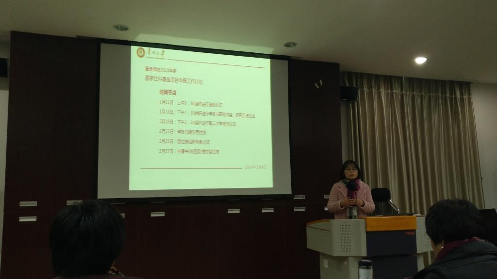 首先由管理学院院长李烨宣布了本次会议的议题及安排。然后由王婷副院长传达了1月4日学校哲社院召开的国家社科基金申报工作推进会的会议精神,并宣布了管理学院本次国家基金申报的工作计划及管理制度。王婷副院长随后介绍了学校和管理学院设立的科研特岗,鼓励在座的各位教师积极申报学校和学院的科研特岗,以及申报学校的学术带头人及学术骨干。