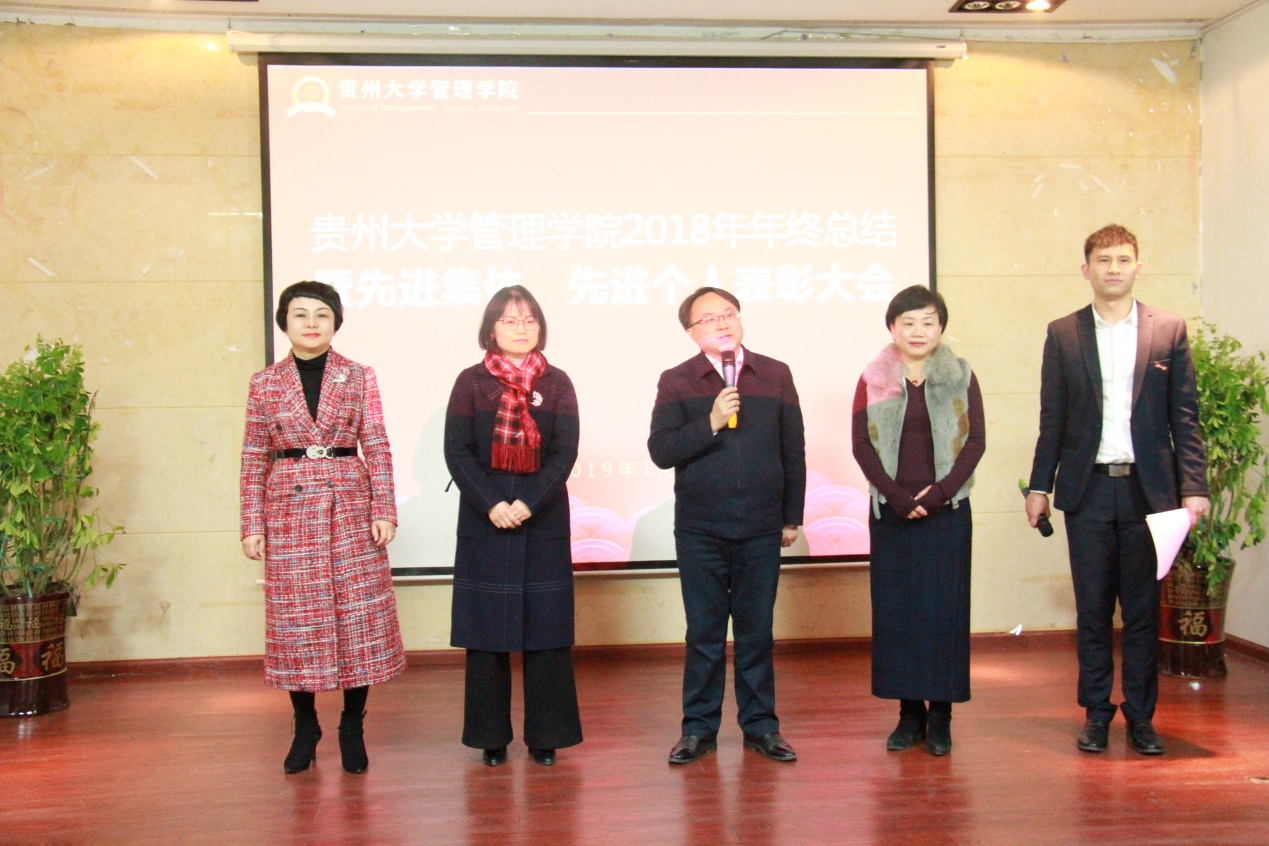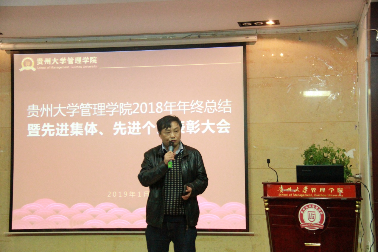 1月11日中午12点50分,体育竞猜网(中国)官方网站2018年年终总结暨先进集体、先进个人表彰大会于管院三楼报告厅隆重举行。贵州大学哲学社会科学研究院院长洪名勇教授;财务处王斌处长;资产管理处周昌洪副处长;法学院党委副书记、原管理学院副处级组织员洪影秋副教授;对外合作处副处长周乐欣副教授;校督导团李景勃老师以及管理学院近五年退休的各位老师出席本次表彰大会的嘉宾,体育竞猜网(中国)官方网站院长李烨教授;学院副院长王婷教授、周莉莉教授、宋山梅教授以及学院党委副书记张亚军老师出席本次表彰大会,管理学院全体老师参加此次表彰大会,大会由张亚军副书记主持展开。