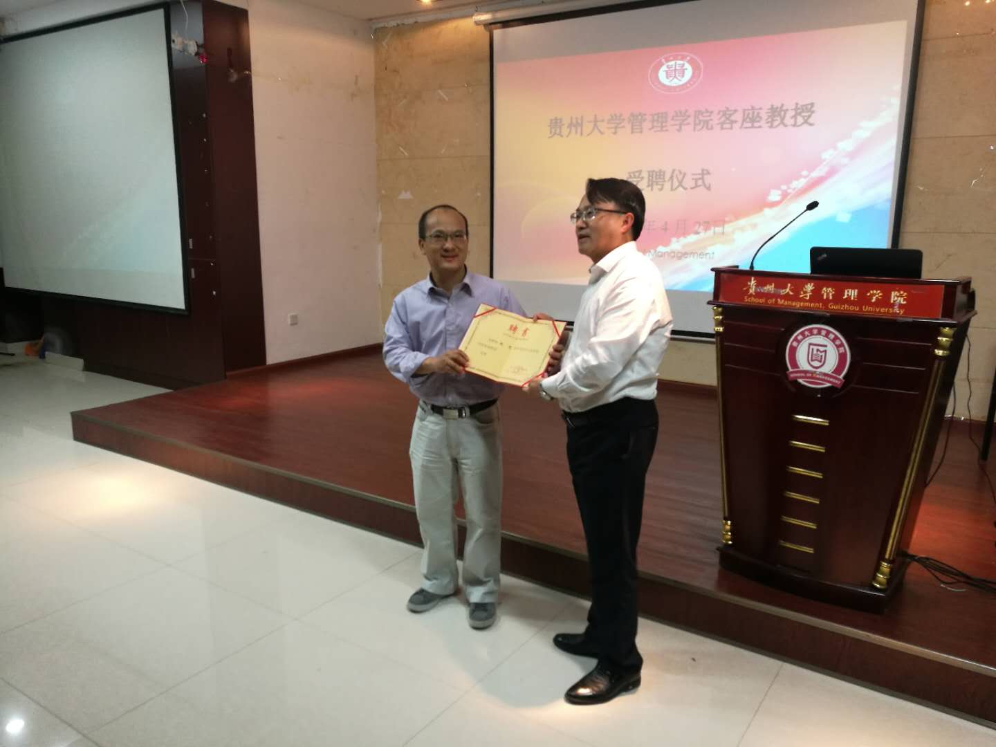 讲座由体育竞猜网(中国)官方网站副院长王婷教授主持,管理学院全体本科及18级研究生参会,并由李烨院长为赵忠教授颁发贵州大学客座教授聘书。