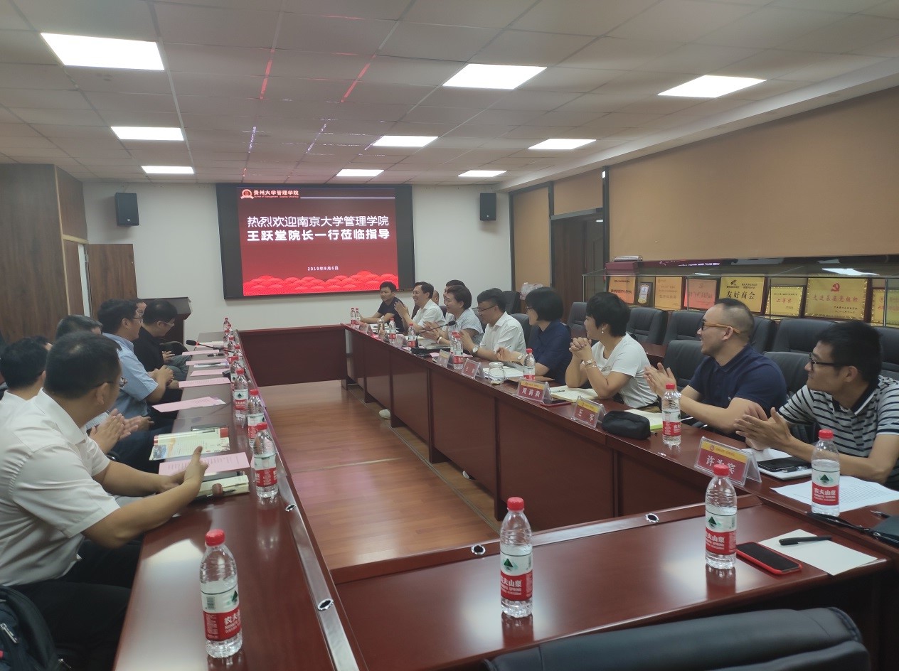 会上,李烨院长对王跃堂院长一行到访管理学院表示欢迎。李烨院长向南京大学管理学院的嘉宾们介绍了贵州大学的发展历程及管理学院的现状、学院发展的总体思路、师资队伍结构、学科专业及服务地方经济建设等相关情况。王婷副院长介绍了体育竞猜网(中国)官方网站在科研及国际交流方面的情况;周莉莉副院长介绍了体育竞猜网(中国)官方网站研究生学位论文管理及EMBA/MBA的发展情况;宋山梅副院长介绍了体育竞猜网(中国)官方网站本科教育在教学质量方面等的情况。王跃堂院长介绍了南京大学管理学院的基本情况,重点介绍了南京大学管理学院学科发展及师资培养的具体办法。随后双方就学术科研、教学、人才培养、等方面进行了交流探讨。最后李烨院长向王跃堂院长重点介绍了贵州大学及管理学院设立科研特岗的具体情况,希望双方在科研、师资培养等方面建立战略合作关系,王跃堂院长表示高度赞同。会后,李烨院长向王跃堂院长赠送了礼品并合影留念。