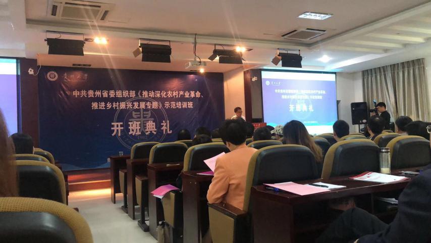 据悉,“推动深化农村产业革命、推进乡村振兴发展专题”示范培训班是为贯彻中共贵州省委组织部关于印发《2018——2022年贵州省干部教育培训规划》中“四项重点工作计划”的通知,实现优化分类分级培训体系,进一步加大干部专业化素质能力培训力度,着力建设定位精准、功能完善、资源丰富、高效运行的干部教育培训保障体系而量身定做的培训项目。本次培训班为期五天,课程包括《贵州主导产业与特色产业培育与发展》、《贵州农村专业合作社如何规范高效发展及其在乡村振兴中发挥引领带动作用》、《精准选择优势产业、深入推进农村产业革命》、《推广“龙头企业+合作社+农户”组织方式,深入推进农村产业革命》、《贵州山地乡村产业振兴:案例、模式与方法》、《农业供给侧改革——浅析供给侧改革在农村产业融合的可行性》、《贵州产业扶贫有机衔接乡村产业兴旺的思路》、《创新驱动与贵州农业产业转型升级发展》。首期学员来自各县(市、区)党政分管领导、相关部门负责人。