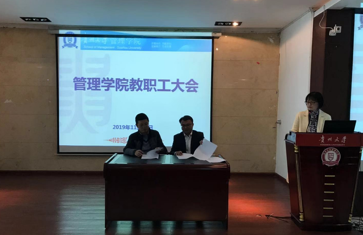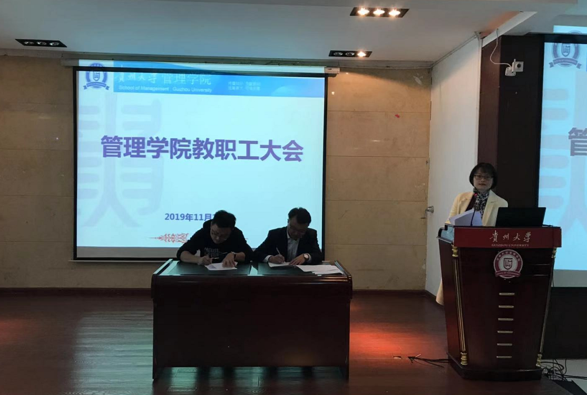 接着,会上进行管理学院2020年国家级项目申报考核目标责任书的签约仪式,由王婷副院长主持。她介绍目前学院开展国家级课题申报的情况,指出目的是为了促进学院2020年国家级课题申报工作的顺利进行,确保能完成学校下达的考核工作任务。管理科学与工程系、营销与电商系、工商管理系和会计系的系主任分别上台与李烨院长签订责任书。