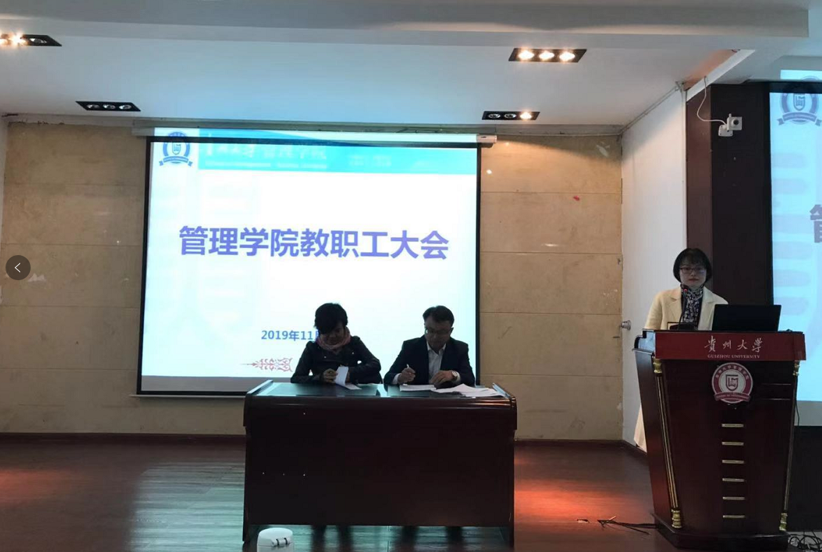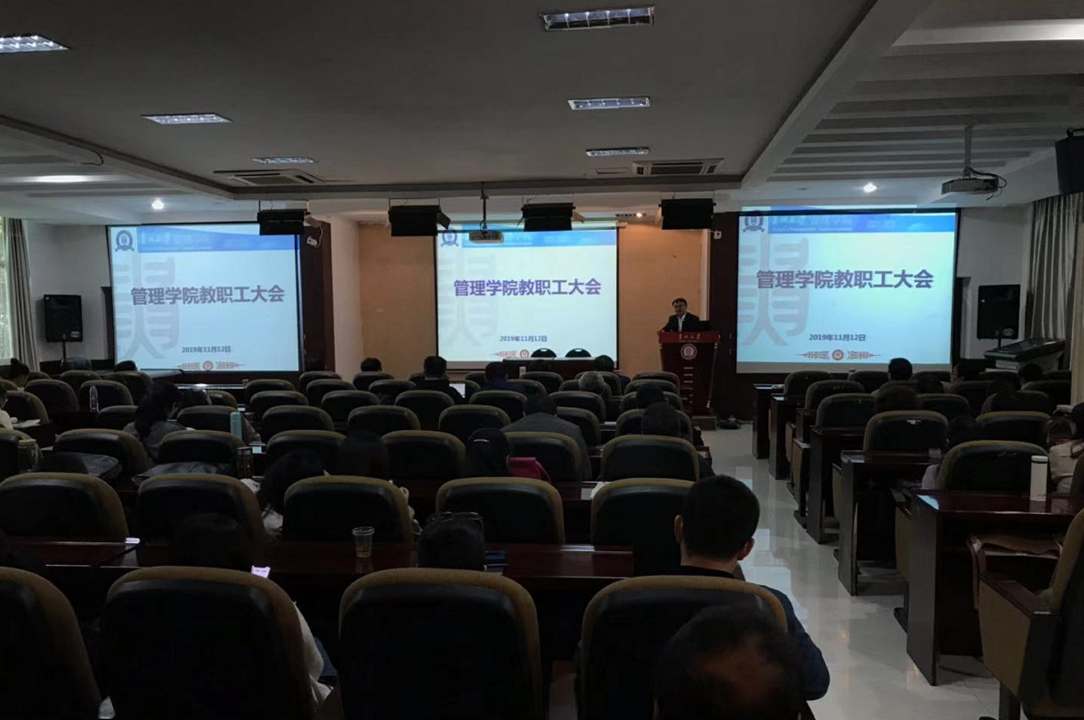 2019年11月12日中午13:00,学院在致远楼三楼报告厅召开全院教职工大会。学院党政领导班子、全体教职工及学生正式党员参加会议。会议由学院院长李烨教授主持。