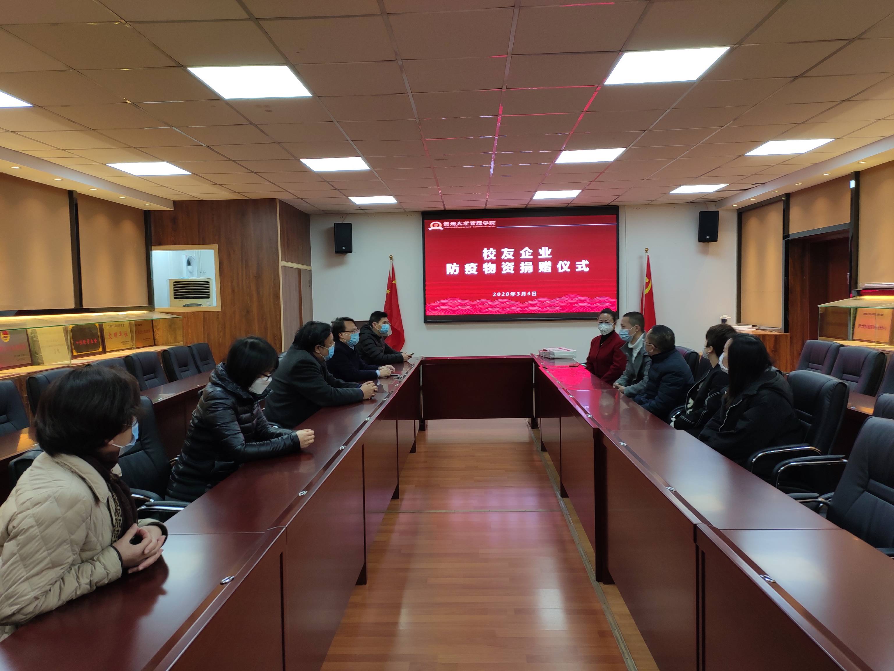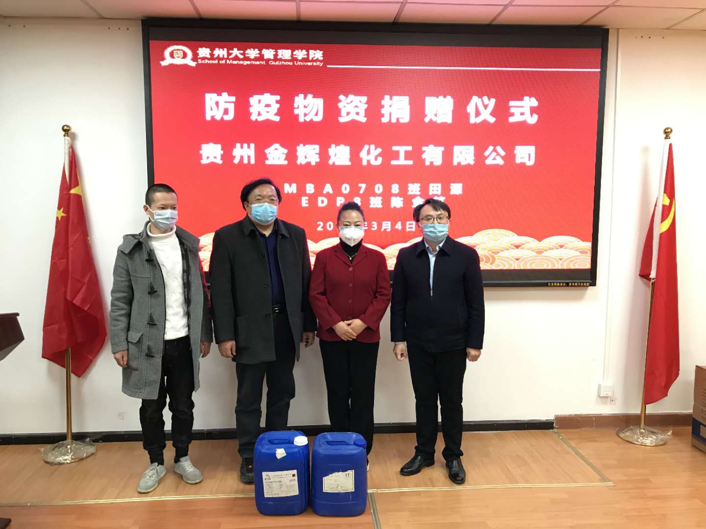 沧海横流,方显英雄本色。困难当前,方显责任担当。疫情发生以来,社会各界都在防控疫情、复工复产复教方面积极贡献力量。3月4日上午10:30,一场暖心的捐赠仪式在体育竞猜网(中国)官方网站陈列室举行。为在疫情防控物资紧缺的关键时刻,助力贵州大学“停课不停教、停课不停学”,经体育竞猜网(中国)官方网站联系对接,体育竞猜网(中国)官方网站校友企业贵州省中小企业服务集团捐赠口罩3000只,贵州金辉煌化工有限公司捐赠84消毒液1吨。体育竞猜网(中国)官方网站党委书记王秀峰,院长李烨,副院长王婷、宋山梅,办公室主任陈健,对外合作办公室主任王云,EMBA14期班贵州中小企业集团董事总经理孙大奎及办公室人员,MBA0708班贵州金辉煌化工有限公司总经理田源、EDP八班陈金筑出席了捐赠仪式,宋山梅副院长主持捐赠仪式。