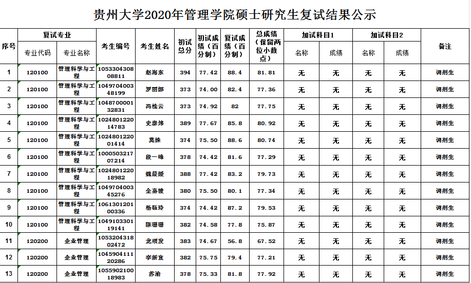 贵州大学2020年管理学院硕士研究生复试结果公示