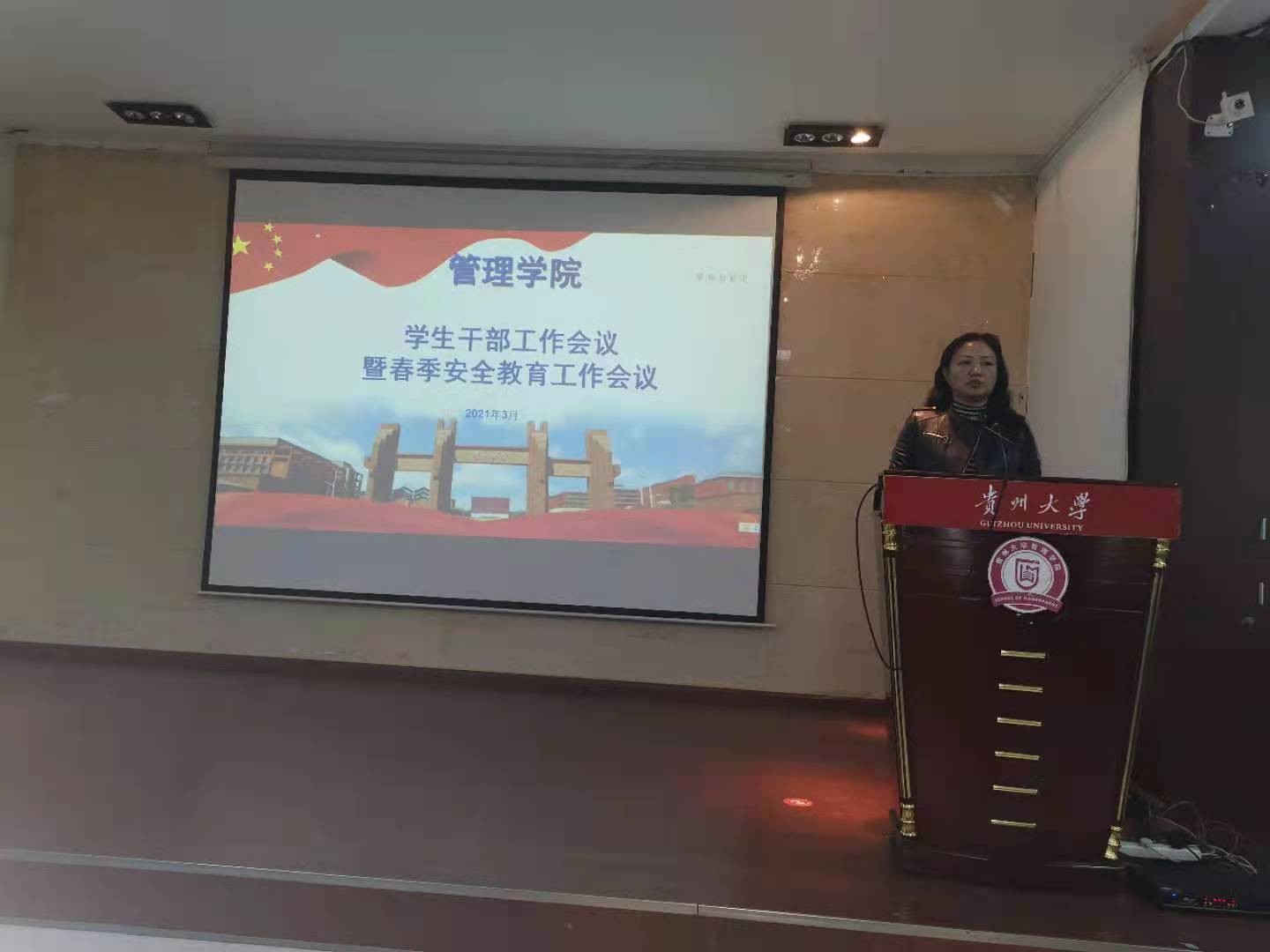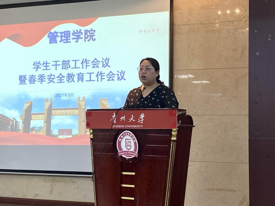 在清明假期即将到来之际,为了加强学生安全意识,提高体育竞猜网(中国)官方网站班级和学生组织的工作能。2021年3月29日中午13:00,管理学院在三楼报告厅召开学生干部工作会议暨春季安全教育工作会议。出席本次会议的老师有院党委副书记洪影秋老师、学生科科长芮丽华老师、团委负责人陈芊羽老师、学生科辅导员向珂莹老师、车婧娴老师、陈黔江老师以及各班级、各学生组织的学生干部。会议由芮丽华老师主持。