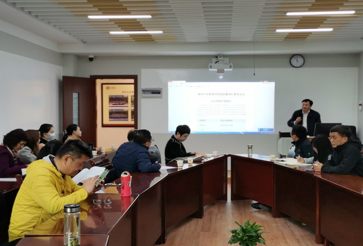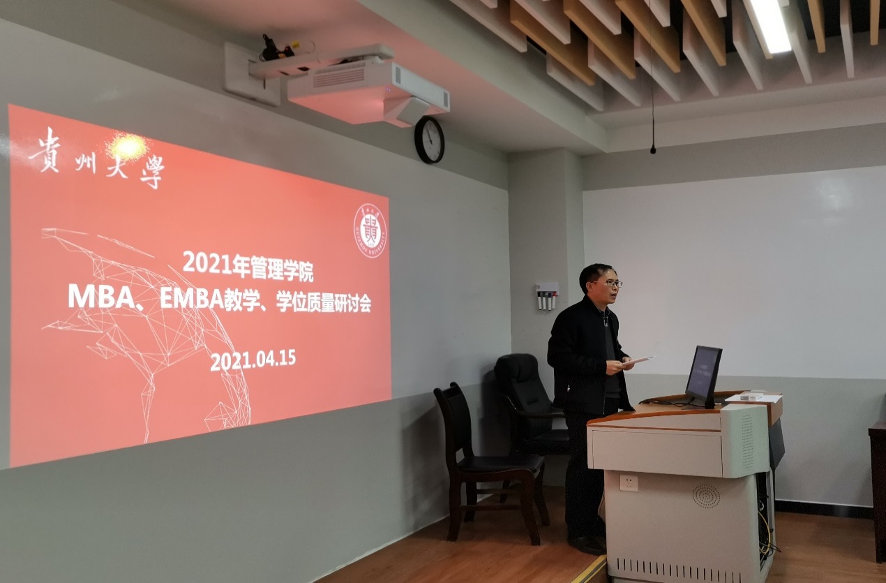 2021年4月15日上午,体育竞猜网(中国)官方网站MBA教育中心在202教室举行“2021年管理学院MBA、EMBA教学及学位质量研讨会”。贵州大学研究生院院长杜滨教授、管理学院副院长周莉莉教授、30余位MBA中心任课老师及研究生导师、MBA中心主任项凯标教授、EMBA中心主任李雨峰老师、MBA中心副主任何跃勇老师、MBA中心办公室主任邓琳老师以及中心工作人员共40余位人参加了此次研讨会。研讨会由副院长周莉莉教授主持。