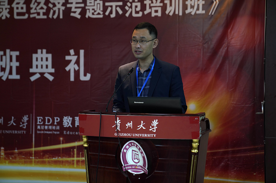 令狐彩桃致辞。她代表学校对莅临开班典礼的领导与嘉宾表示感谢,对参加培训的学员表示欢迎,并介绍了贵州大学概况及学校EDP教育中心建设定位。她表示,生态文明是实现“两个一百年”奋斗目标、全面建成小康社会不可或缺的衡量指标,关系人民福祉、关乎民族未来。本次培训旨在加快转变贵州经济发展方式,推动形成人与自然和谐发展的现代化建设新格局,推动经济高质量发展迈出更大步伐。她指出,本次课程设计针对性和实效性较强,希望学员们珍惜宝贵的学习机会,在学深悟透上下功夫,在知行合一上下功夫。