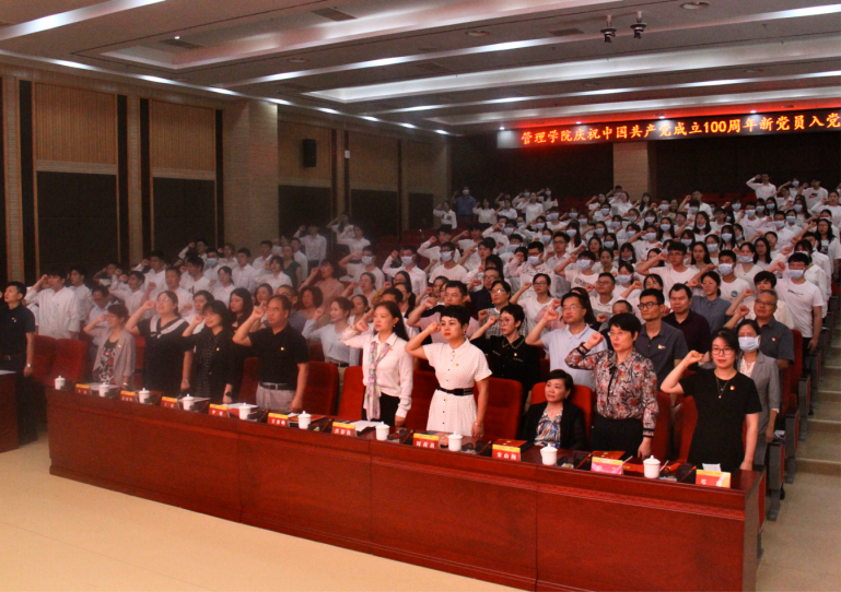 贵大新闻网讯6月30日中午,管理学院庆祝中国共产党成立100周年新党员入党宣誓暨“七·一”表彰大会在西校区贤正楼报告厅举行。管理学院党委书记王秀峰出席会议,学院副书记洪影秋、副院长罗敏、王婷、周莉莉、宋山梅,各科室负责人、教工党员、学生党员代表及入党积极分子参加大会。