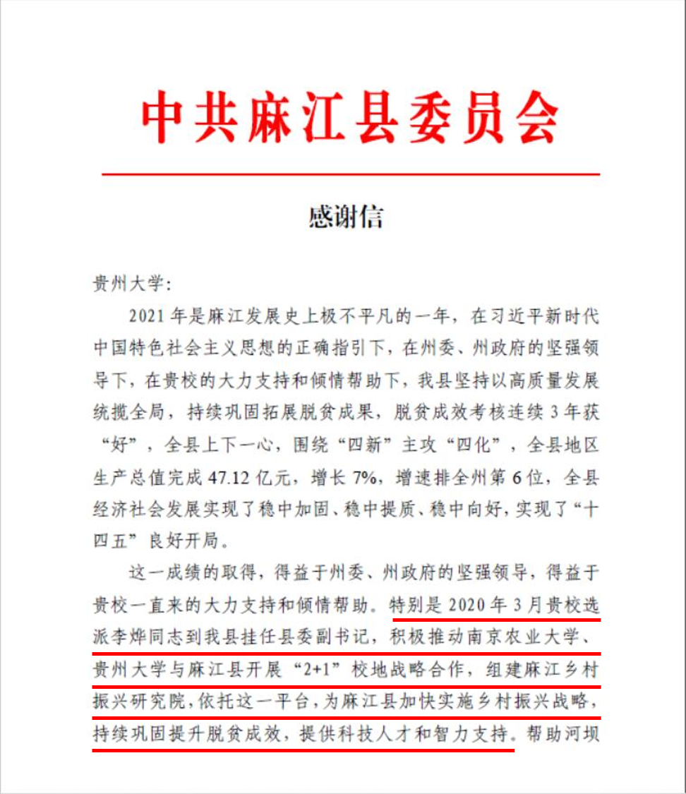 信中特别指出,体育竞猜网(中国)官方网站院长李烨在挂任麻江县委副书记期间,积极推动南京农业大学、贵州大学与麻江县开展“2+1”校地战略合作,组建麻江乡村振兴研究院,依托这一平台,为麻江县加快实施乡村振兴战略,持续巩固提升脱贫成效,提供科技人才和智力支持。同时,在帮助申报少数民族传统村落示范村、省级和州级特色田园乡村·乡村振兴集成示范试点,培训各类人员,外资引进和发展教育等方面贵州大学都做了大量卓有成效的工作。