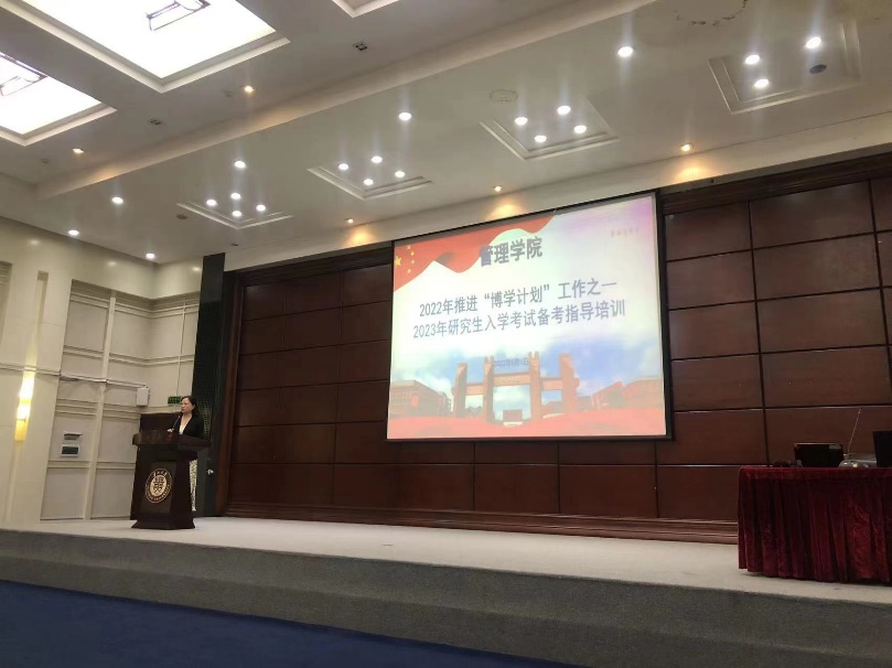 为推动学院“博学计划”工作顺利开展,帮助考研学生暑期高效备考,6月1日中午,管理学院在东校区1号行政楼报告厅举行2023年研究生入学考试备考指导培训会,邀请华图教育负责人朱小曼老师,周佳胜老师一行人来做培训指导。体育竞猜网(中国)官方网站党委副书记洪影秋出席,辅导员陈黔江、向珂莹,车婧娴和2019级学生参加培训会。培训会由党委副书记洪影秋主持。