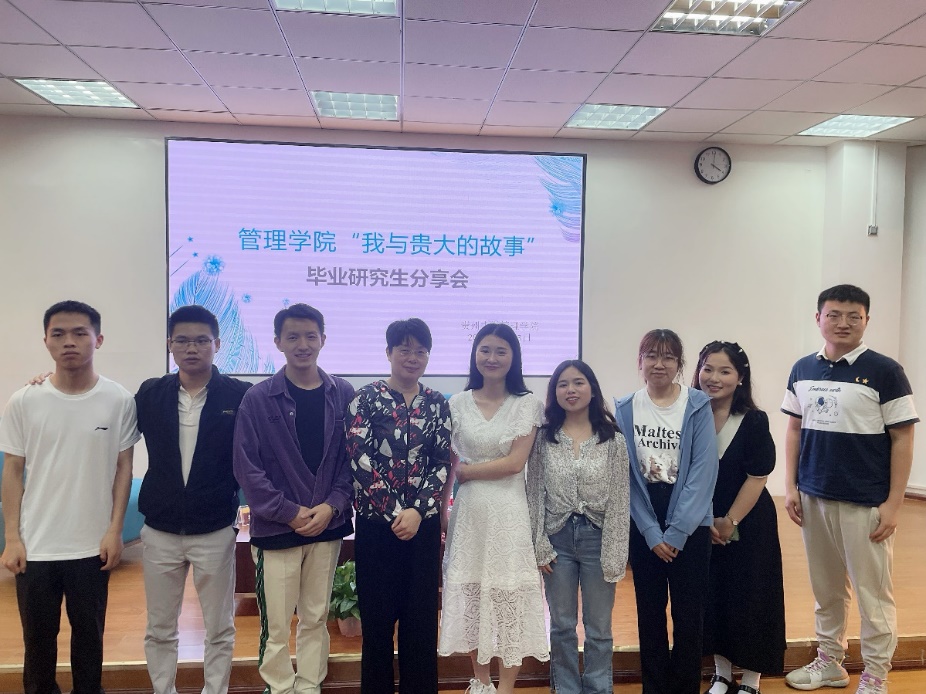 为发扬优秀毕业研究生榜样的精神,引导更多的同学向先进看齐,营造争先奋进的良好校园氛围。6月13日下午,“我与贵大的故事”——管理学院2022届硕士研究生毕业分享会在东校区慎思楼MBA报告厅举行。管理学院党委副书记洪影秋、管理学院研究生科科长徐兰、管理学院团委负责人研究生会秘书长车婧娴、管理学院研究生科辅导员龚潇潇、研究生科老师罗敬及全院研究生参加分享会。2019级管理科学与工程专业研究生魏俐华、田美慧,2019级企业管理专业研究生何欣、毛昊旻受邀作为优秀毕业研究生代表,向全院师生作分享汇报。