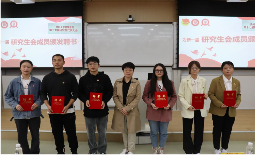 另外,会议选举产生管理学院第十七届研究生会成员,并由研究生科科长徐兰为研究生会代表颁发聘书。