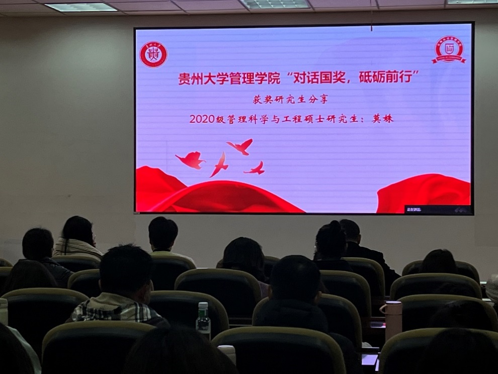 为贯彻落实党的二十大精神,树立先进模范,强化榜样力量,进一步加强校风、学风建设,引领低年级同学做好学业规划,2023年3月6日下午,体育竞猜网(中国)官方网站“对话国奖”主题讲座在东校区慎思楼二楼MBA报告厅举行。管理学院党委副书记、纪委书记邓琳老师出席活动,管理学院MBA中心主任项凯标教授,党政办主任、研究生科科长徐兰老师,研究生科老师,2022-2023学年度研究生国家奖学金获得者莫姝、宋慧琳以及管理学院2021级、2022级全体研究生共同参与活动。本次分享交流会由2022级硕士研究生梁焯然主持。