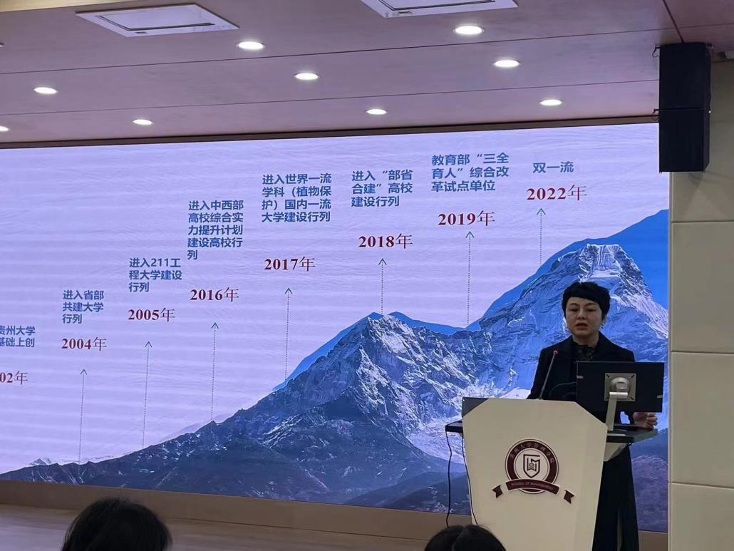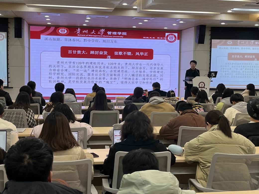 周莉莉书记围绕贵大校史、党的亲切关怀两个方面,为管理学院的研究生们讲述了一段段厚重的学校历史、一个个鼓舞人心的校友故事、一页页奋力谱写的发展篇章。贵州大学经历了120年的变迁与发展,有困难也有成就,有心酸也有汗水,但也正因如此,才建成了如今“明德至善、博学笃行”的部省合建、“双一流”建设高校。周莉莉书记教导同学们要懂得忆苦思甜、抚今追昔,不断加强科研素养、增进科研能力、培养创新精神。