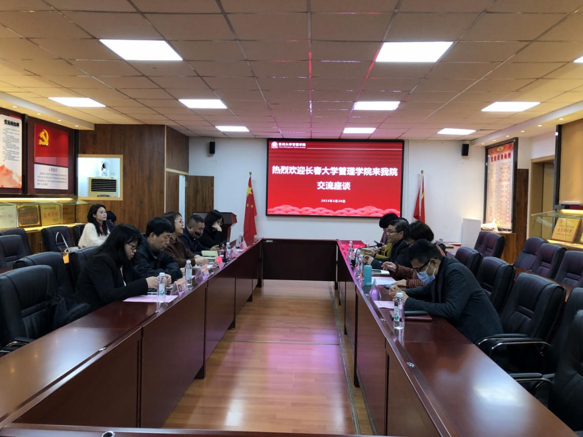 2023年3月28日上午,长春大学管理学院副院长黄晓红、副院长刘富成、会计学系主任程志刚、财务管理系主任唱晓阳、工商管理系副主任张贺一行来体育竞猜网(中国)官方网站调研。体育竞猜网(中国)官方网站副院长李本光、副院长宋山梅、党政办公室主任徐兰、工商管理系主任兼系支部书记许为宾、会计系主任吕凡等与来宾座谈交流。
