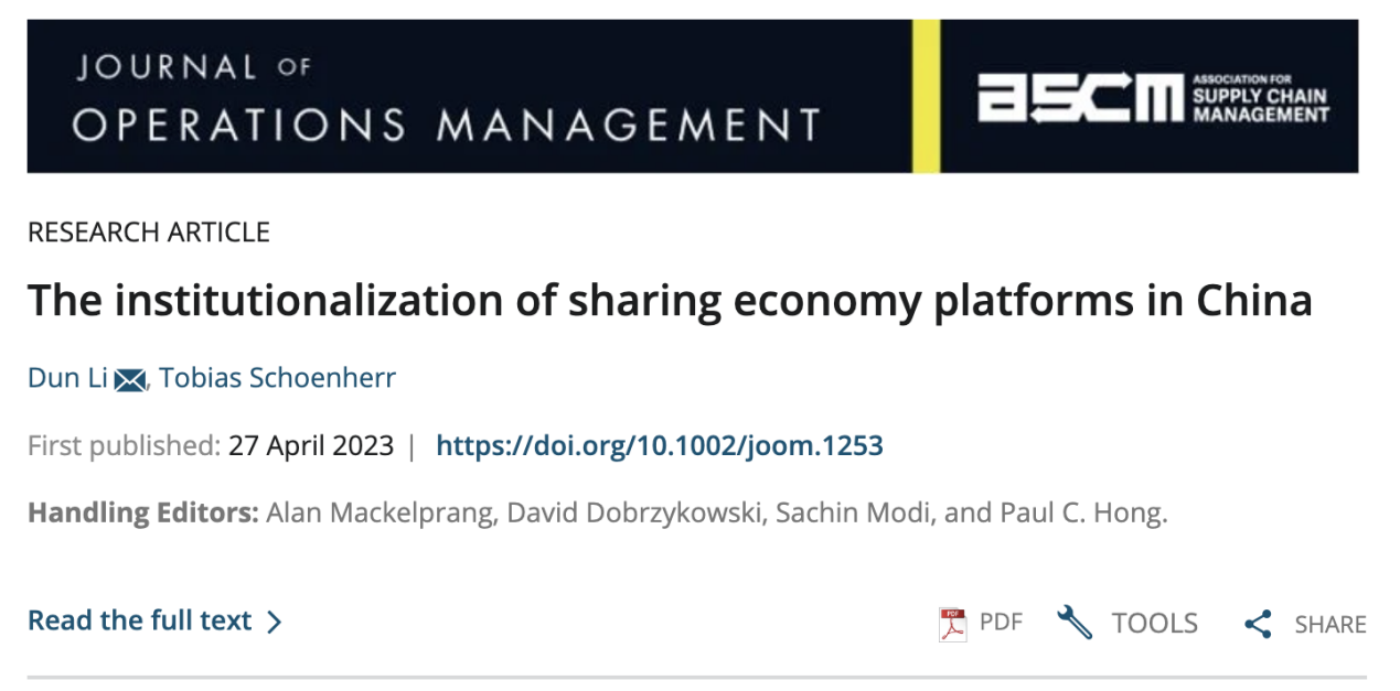 近日,体育竞猜网(中国)官方网站李盾博士与美国密歇根州立大学商学院Tobias Schoenherr教授合作的研究成果《The institutionalization of sharing economy platforms in China》在运营管理/供应链管理国际顶级期刊《Journal of Operations Management》上在线发表。李盾博士为第一作者和通讯作者,体育竞猜网(中国)官方网站为第一署名单位。