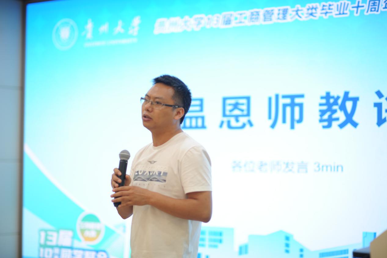 李烨院长代表学院热烈欢迎大家重回母校,他说,大家从全国各地赶来,毕业十年相会聚首,体现了大家对母校的深厚情感。他向校友们简要介绍了学校奋进行动和学院发展情况。希望各位校友珍惜今日难得的相逢时光,与同窗好友再叙当年奋斗时光、与授业恩师讲讲生活近况;希望各位校友能够充分发挥中间桥梁作用,放眼长远继续携手与学院共赴卓越征程,共谋创新发展。祝福和勉励校友们立足自身实际,安顿好生活与工作,努力做出一番事业。贵大管院永远是各位校友人生旅途上的港湾,欢迎大家常回管院歇歇脚、充充电,再出发。