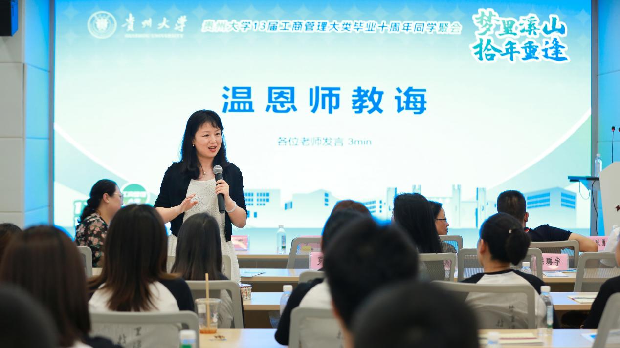 袁新国老师是2009级工商管理大类辅导员兼班主任,她回顾了校友们在校期间学习生活的点点滴滴,表示十年光阴如箭,同学们青春依然,但又多了一份成熟和自信,她感到很欣慰,并祝福大家前程似锦,未来可期。
