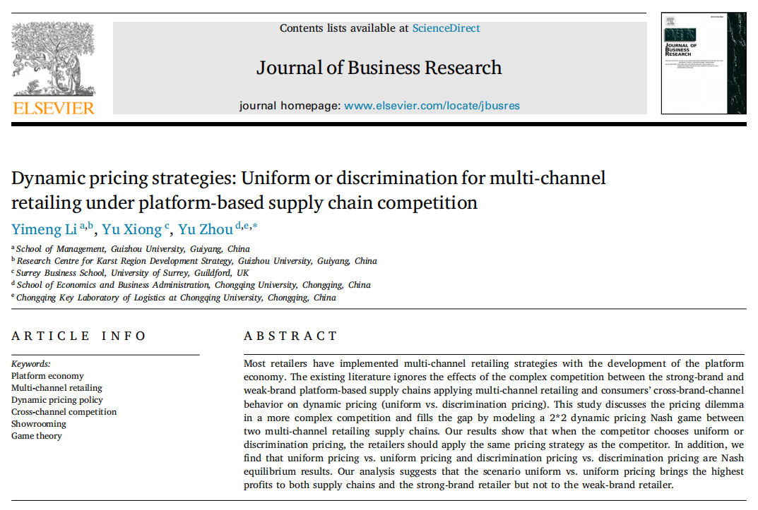 近日,体育竞猜网(中国)官方网站教师李义猛的最新研究成果《Dynamic pricing strategies: Uniform or discrimination for multi-channel retailing under platform-based supply chain competition》在国际知名期刊《Journal of Business Research》上在线发表。李义猛博士为论文第一作者,体育竞猜网(中国)官方网站为第一署名单位。