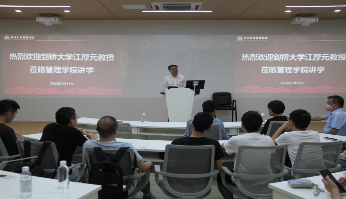 7月11日下午,管理学院学术讲座顺利举行,本次学术讲座邀请到来自剑桥大学商学院的江厚元教授主讲,本次讲座由管理学院李盾博士主持。