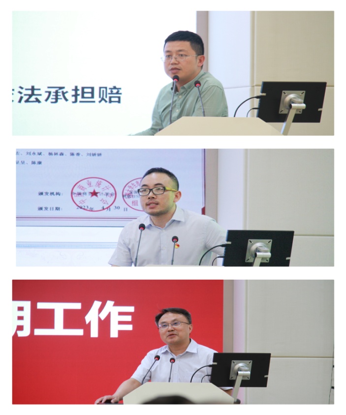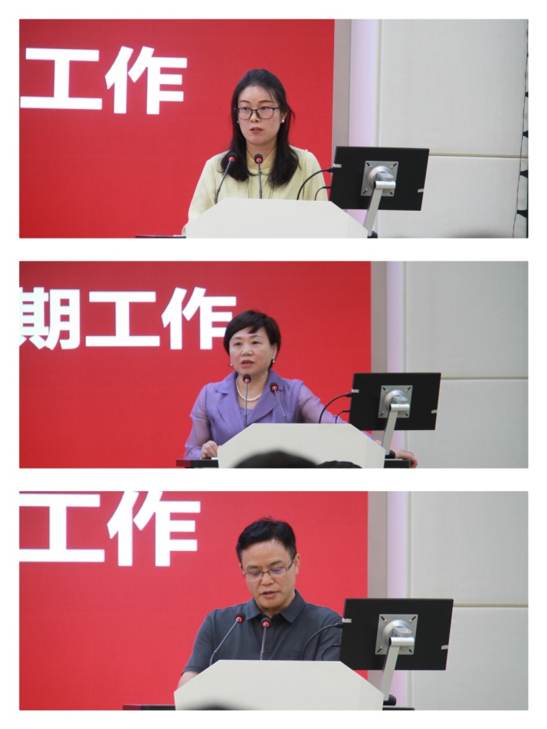会议的第二阶段,学院相关工作的通报和安排部署。院党委副书记邓琳就本学期党员发展情况、学生安全问题、征兵工作、就业情况、团委工作(挑战杯、三下乡社会实践)等作了通报和部署安排,并通报了师德师风的典型案例。副院长宋山梅通报了教学工作,包括一流专业建设安排和经费管理情况、一流课程建设项目情况、教育部产学合作协同育人项目申报、教学质量和人才培养质量提升要求、学科竞赛情况;副院长李本光通报了MBA教育中心教育学研讨会、研究生教学问题、论文抽检与处理情况、研究生申报项目情况;副院长王婷通报了一流学科建设和博士后工作站的申报推进情况。