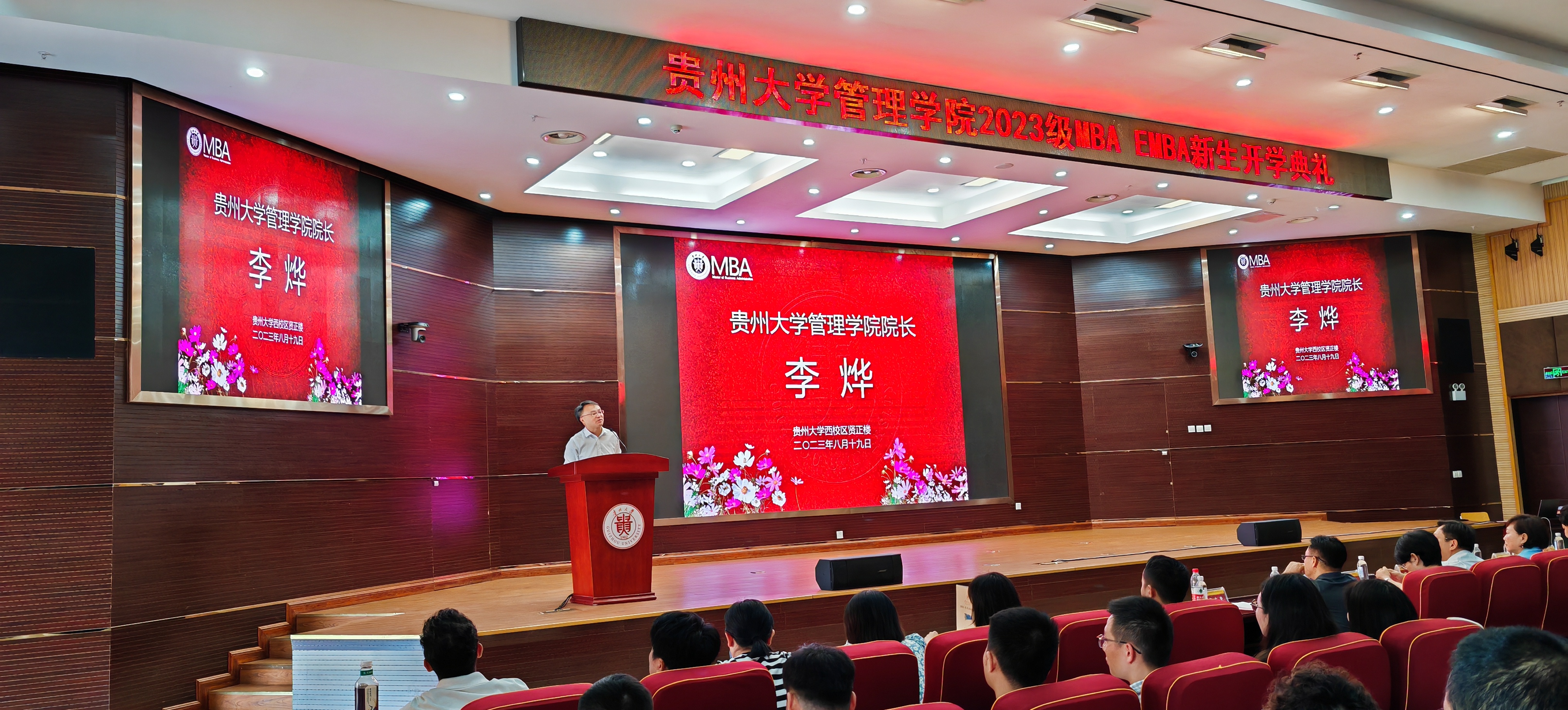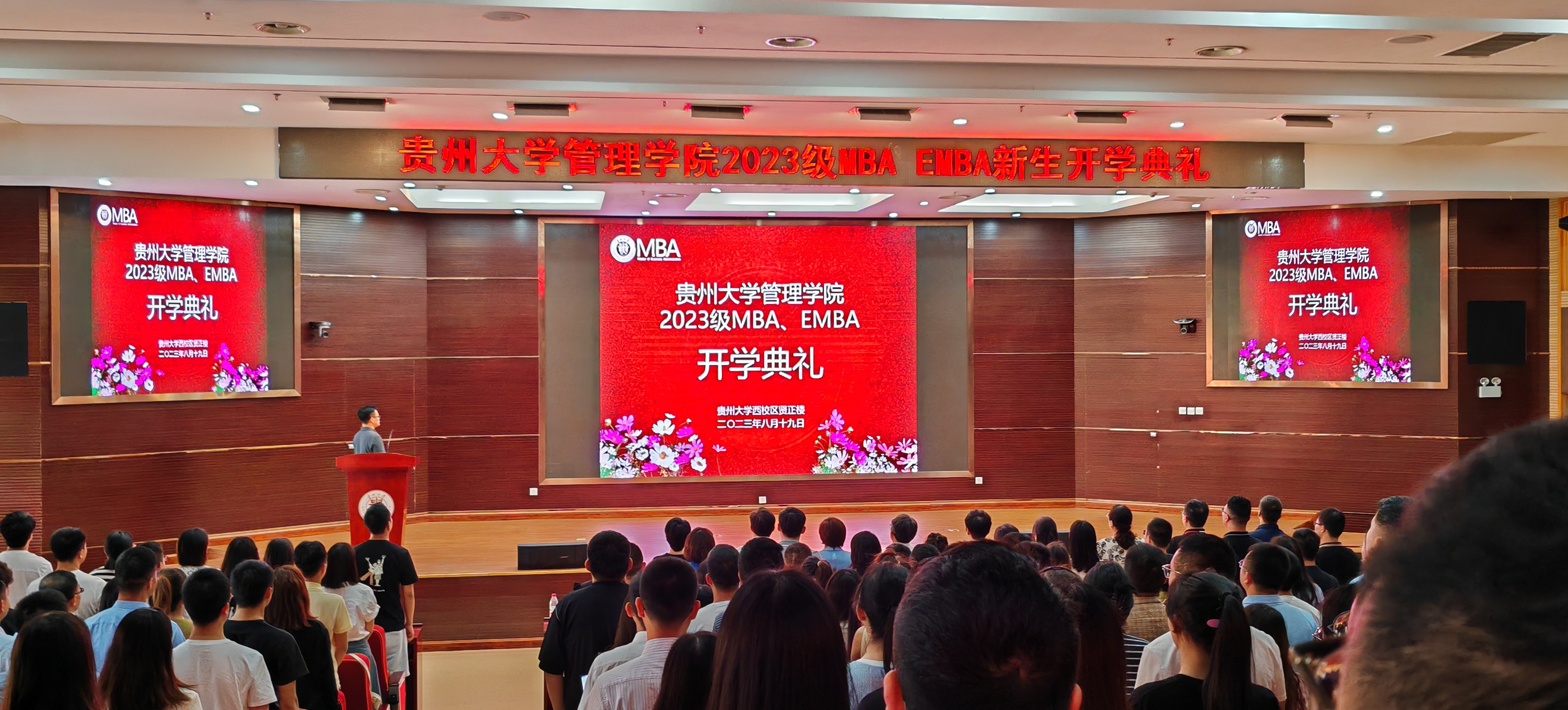 2023年8月19日上午,体育竞猜网(中国)官方网站MBA教育中心在西校区贤正楼107报告厅隆重举行了“体育竞猜网(中国)官方网站2023级工商管理硕士(MBA暨EMBA)开学典礼”。体育竞猜网(中国)官方网站院长李烨教授,贵州大学党委正处级组织员、管理学院党委副书记(主持党委工作)周莉莉教授,管理学院副院长李本光教授,副院长宋山梅教授,副书记邓琳老师,MBA中心主任项凯标教授,MBA导师代表刘遗志教授,管理学院各科室负责人、MBA教育中心全体老师、班主任,2023级MBA、EMBA新生共460余名参加了开学典礼。典礼由副院长李本光教授主持。