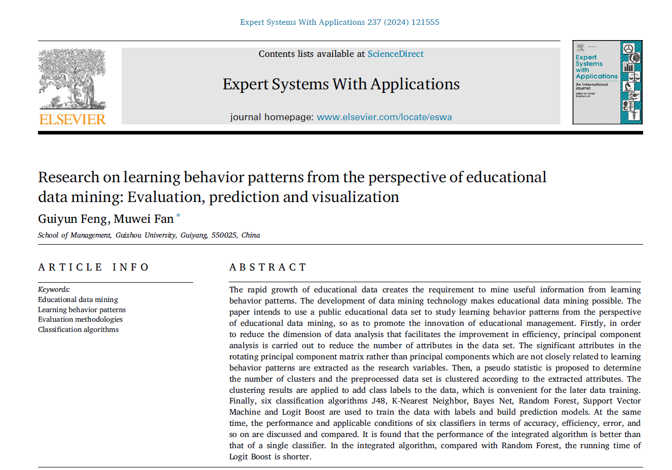 体育竞猜网(中国)官方网站管理科学与工程系硕士研究生冯桂云,教师范慕炜博士(通讯作者)在Expert Systems with Applications期刊(中科院一区顶刊,IF:8.5)发表文章《Research on learning behavior patterns from the perspective of educational data mining: Evaluation, prediction and visualization》。